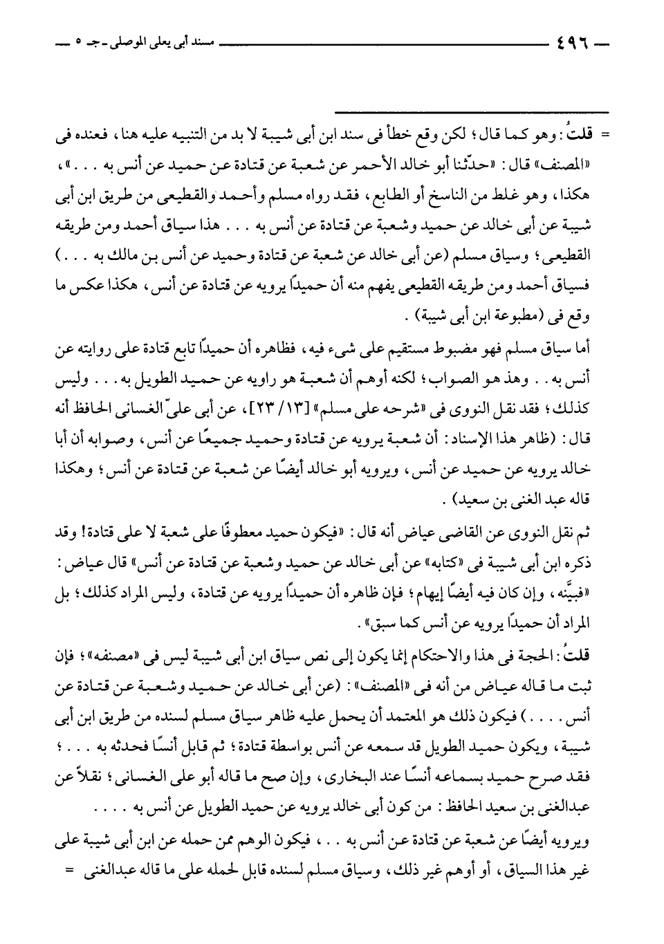 = قلتُ: وهو كما قال؛ لكن وقع خطأ في سند ابن أبى شيبة لا بد من التنبيه عليه هنا، فعنده في "المصنف" قال: "حدّثنا أبو خالد الأحمر عن شعبة عن قتادة عن حميد عن أنس به ... "، هكذا، وهو غلط من الناسخ أو الطابع، فقد رواه مسلم وأحمد والقطيعى من طريق ابن أبى شيبة عن أبى خالد عن حميد وشعبة عن قتادة عن أنس به ... هذا سياق أحمد ومن طريقه القطيعى؛ وسياق مسلم (عن أبى خالد عن شعبة عن قتادة وحميد عن أنس بن مالك به ... ) فسياق أحمد ومن طريقه القطيعى يفهم منه أن حميدًا يرويه عن قتادة عن أنس، هكذا عكس ما وقع في (مطبوعة ابن أبى شيبة).