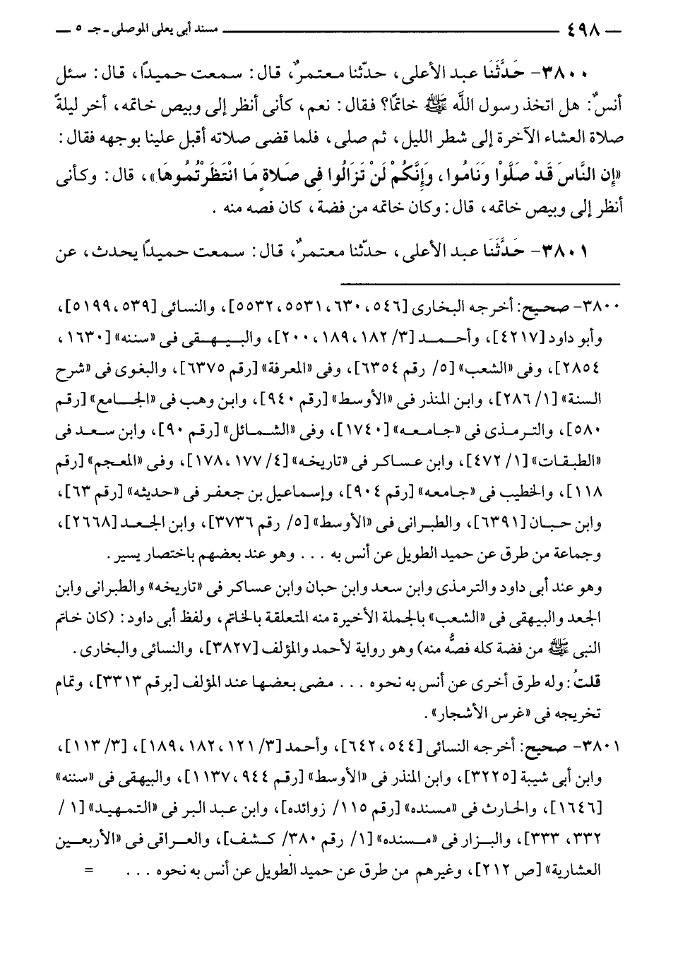 ٣٨٠٠ - حَدَّثَنَا عبد الأعلى، حدّثنا معتمرٌ، قال: سمعت حميدًا، قال: سئل أنسٌ: هل اتخذ رسول الله - صلى الله عليه وسلم - خاتمًا؟ فقال: نعم، كأنى أنظر إلى وبيص خاتمه، أخر ليلةً صلاة العشاء الآخرة إلى شطر الليل، ثم صلى، فلما قضى صلاته أقبل علينا بوجهه فقال: "إِن النَّاسَ قَدْ صَلَّوْا وَنَامُوا، وَإنَّكُمْ لَنْ تَزَالُوا فِي صَلاةٍ مَا انْتَظَرْتُمُوهَا"، قال: وكأنى أنظر إلى وبيص خاتمه، قال: وكان خاتمه من فضة، كان فصه منه.