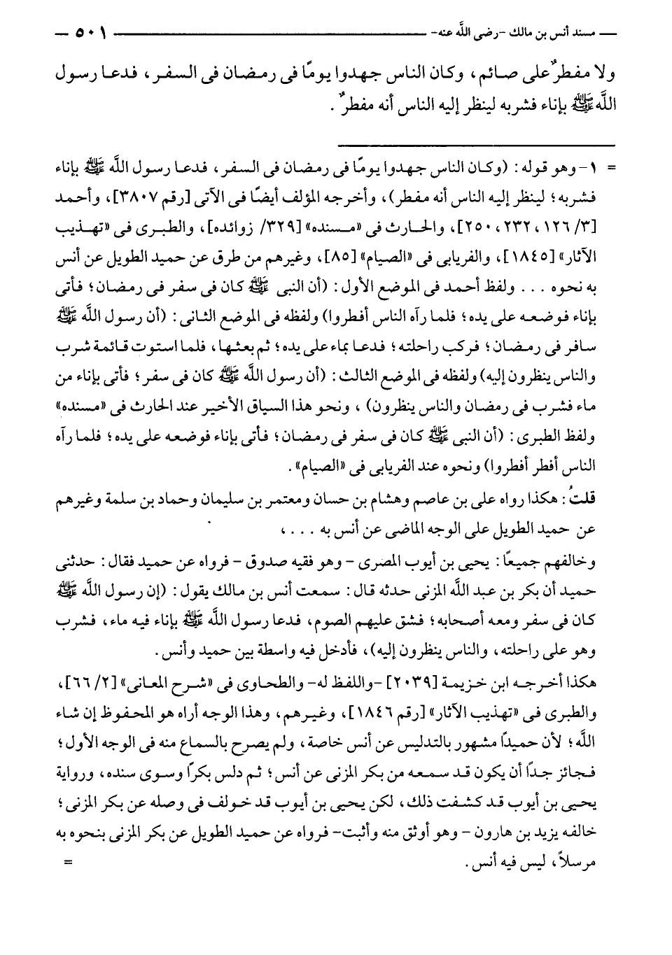 هكذا أخرجه ابن خزيمة [٢٠٣٩]- واللفظ له - والطحاوى في "شرح المعانى" [٢/ ٦٦]، والطبرى في "تهذيب الآثار" [رقم ١٨٤٦]، وغيرهم، وهذا الوجه أراه هو المحفوظ إن شاء الله؛ لأن حميدًا مشهور بالتدليس عن أنس خاصة، ولم يصرح بالسماع منه في الوجه الأول؛ فجائز جدًّا أن يكون قد سمعه من بكر المزنى عن أنس؛ ثم دلس بكرًا وسوى سنده، ورواية يحيى بن أيوب قد كشفت ذلك، لكن يحيى بن أيوب قد خولف في وصله عن بكر المزنى؛ خالفه يزيد بن هارون - وهو أوثق منه وأثبت - فرواه عن حميد الطويل عن بكر المزنى بنحوه به مرسلًا، ليس فيه أنس. =