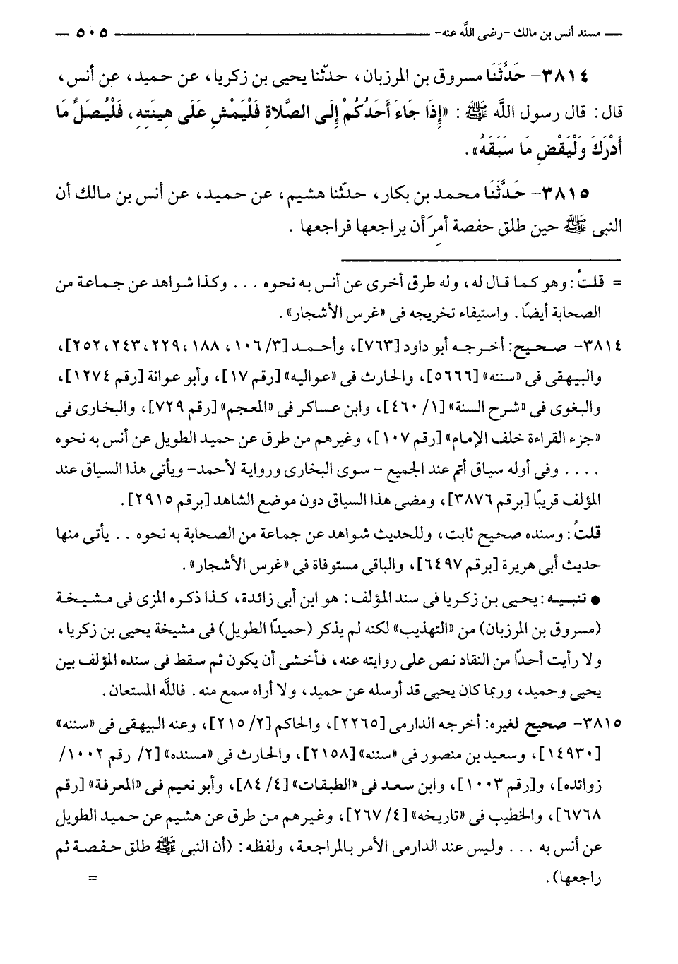 • تنبيه: يحيى بن زكريا في سند المؤلف: هو ابن أبى زائدة، كذا ذكره المزى في مشيخة (مسروق بن المرزبان) من "التهذيب" لكنه لم يذكر (حميدًا الطويل) في مشيخة يحيى بن زكريا، ولا رأيت أحدًا من النقاد نص على روايته عنه، فأخشى أن يكون ثم سقط في سنده المؤلف بين يحيى وحميد، وربما كان يحيى قد أرسله عن حميد، ولا أراه سمع منه. فاللَّه المستعان.