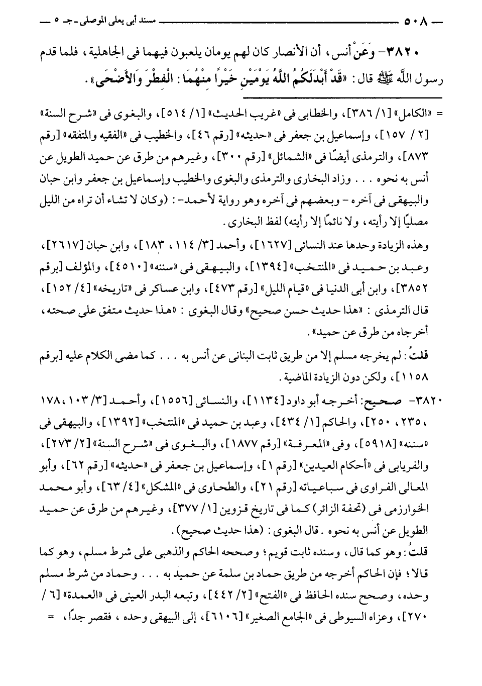 ٣٨٢٠ - صحيح: أخرجه أبو داود [١١٣٤]، والنسائى [١٥٥٦]، وأحمد [٣/ ١٠٣، ١٧٨، ٢٣٥، ٢٥٥]، والحاكم [١/ ٤٣٤]، وعبد بن حميد في "المنتخب" [١٣٩٢]، والبيهقى في "سننه" [٥٩١٨]، وفى "المعرفة" [رقم ١٨٧٧] والبغوى في "شرح السنة" [٢/ ٢٧٣]، والفريابى في "أحكام العيدين" [رقم ١]، وإسماعيل بن جعفر في "حديثه" [رقم ٦٢]، وأبو المعالى الفراوى في سباعياته [رقم ٢١]، والطحاوى في "المشكل" [٤/ ٦٣]، وأبو محمد الخوارزمى في (تحفة الزائر) كما في تاريخ قزوين [١/ ٣٧٧]، وغيرهم من طرق عن حميد الطويل عن أنس به نحوه. قال البغوى: (هذا حديث صحيح).