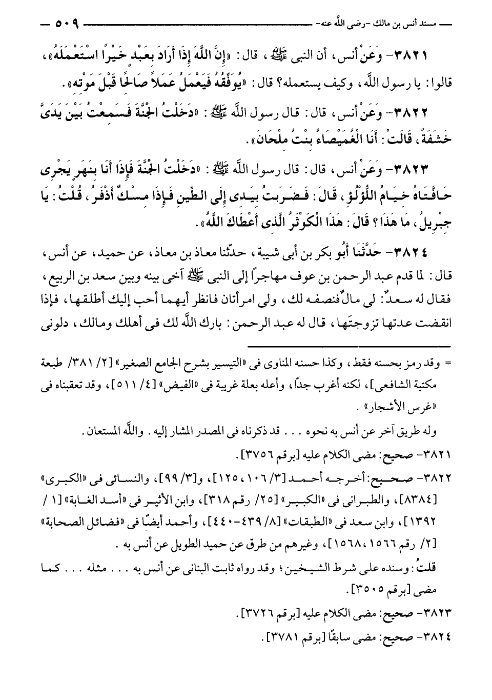٣٨٢٢ - وَعَنْ أنس، قال: قال رسول الله - صلى الله عليه وسلم -: "دَخَلْتُ الجَنَّةَ فَسَمِعْتُ بَيْنَ يَدَيَّ خَشَفَةً، قَالَتْ: أَنَا الْغُمَيْصَاءُ بِنْتُ مِلْحَانَ".