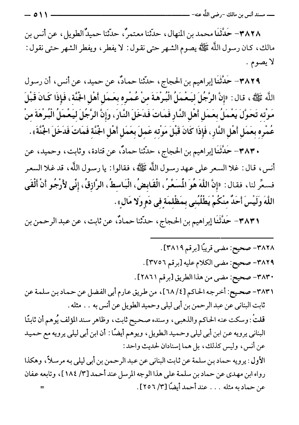 ٣٨٣٠ - صحيح: أخرجه الحاكم [٤/ ٦٨]، من طريق عارم أبى الفضل عن حماد بن سلمة عن ثابت البنانى عن عبد الرحمن بن أبى ليلى وحميد الطويل عن أنس به .. مثله.