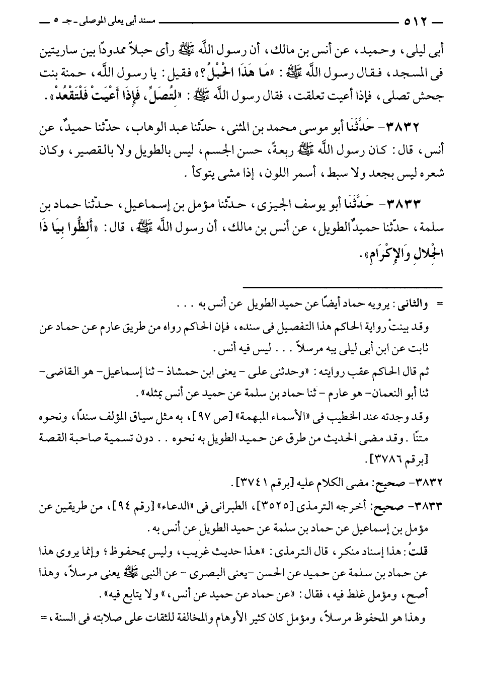 ٣٨٣٣ - حَدَّثَنَا أبو يوسف الجيزى، حدّثنا مؤمل بن إسماعيل، حدّثنا حماد بن سلمة، حدّثنا حميدٌ الطويل، عن أنس بن مالك، أن رسول الله - صلى الله عليه وسلم -، قال: "أَلِظُّوا بِيَا ذَا الجلالِ وَالإِكْرَامِ".