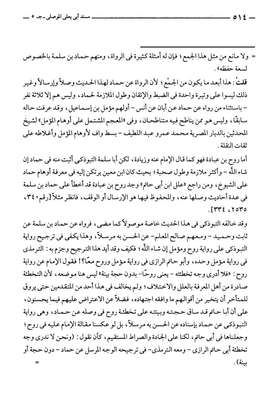 وقد خالفه التبوذكى في هذا الحديث خاصة موصولًا كما مضى، فرواه عن حماد بن سلمة عن ثابت وحميد - ومعهم صالح المعلم - عن الحسن به مرسلًا، وهذا يكفى في ترجيح رواية التبوذكى على رواية روح ومؤمل إن شاء الله؛ فكيف وقد أيد هذا الترجيح وجزم به: الترمذى في رواية مؤمل وحده، وأبو حاتم الرازى في رواية مؤمل وروح معًا؟! فقول الإمام عن رواية روح: "فلا أدرى وجه تخطئته - يعنى روحًا - بدون حجة بينة" ليس هنا موضعه، لأن التخطئة صادرة من أهل المعرفة بالعلل والاختلاف؛ ولم يخالف في هذا أحد من المتقدمين حتى يروق للمتأخر أن يتخير من أقوالهم ما وافقه اجتهاده، فضلًا عن الاعتراض عليهم فيما يحسنون، على أن أبا حاتم قد ساق حجته وبينته على تخطئة روح في وصله عن حماد، وهى رواية التبوذكى عن حماد بإسناده عن الحسن به مرسلًا، بل لو عكسنا مقالة الإمام عليه في روح؛ وجعلناها في أبى حاتم، لكنا على الجادة والصراط المستقيم، كأن نقول: (ونحن لا ندرى وجه تخطئة أبى حاتم الرازى - ومعه الترمذى - في ترجيحه الوجه المرسل عن حماد - دون حجة أو بينة). =