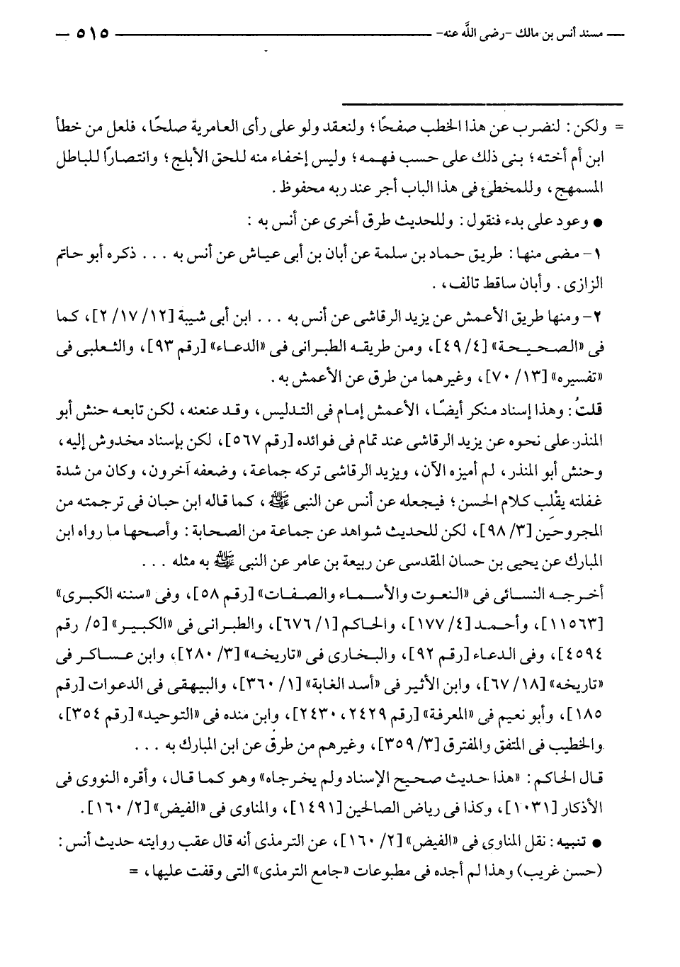 ٢ - ومنها طريق الأعمش عن يزيد الرقاشى عن أنس به ... ابن أبى شيبة [١٢/ ١٧/ ٢]، كما في "الصحيحة" [٤/ ٤٩]، ومن طريقه الطبراني في "الدعاء" [رقم ٩٣]، والثعلبى في "تفسيره" [١٣/ ٧٠]، وغيرهما من طرق عن الأعمش به.