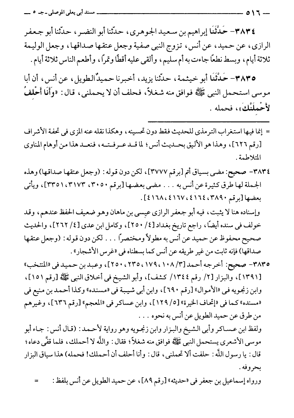 ٣٨٣٥ - حَدَّثَنَا أبو خيثمة، حدّثنا يزيد، أخبرنا حميدٌ الطويل، عن أنس، أن أبا موسى استحمل النبي - صلى الله عليه وسلم - فوافق منه شغلًا، فحلف أن لا يحملنى، قال: "وَأَنَا أَحْلِفُ لأَحْملَنَّكَ"، فحمله.