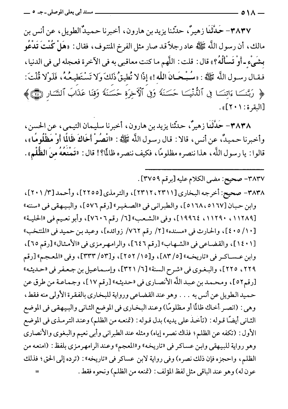 ٣٨٣٨ - حَدَّثَنَا زهيرٌ، حدّثنا يزيد بن هارون، أخبرنا سليمان التيمى، عن الحسن، وأخبرنا حميدٌ، عن أنس، قالا: قال رسول الله - صلى الله عليه وسلم -: "انْصُرْ أَخَاكَ ظَالمًا أَوْ مَظْلُومًا"، قالوا: يا رسول الله، هذا ننصره مظلومًا، فكيف ننصره ظالمًا؟! قال: "تَمْنَعُهُ مِنَ الظُلْمِ".
