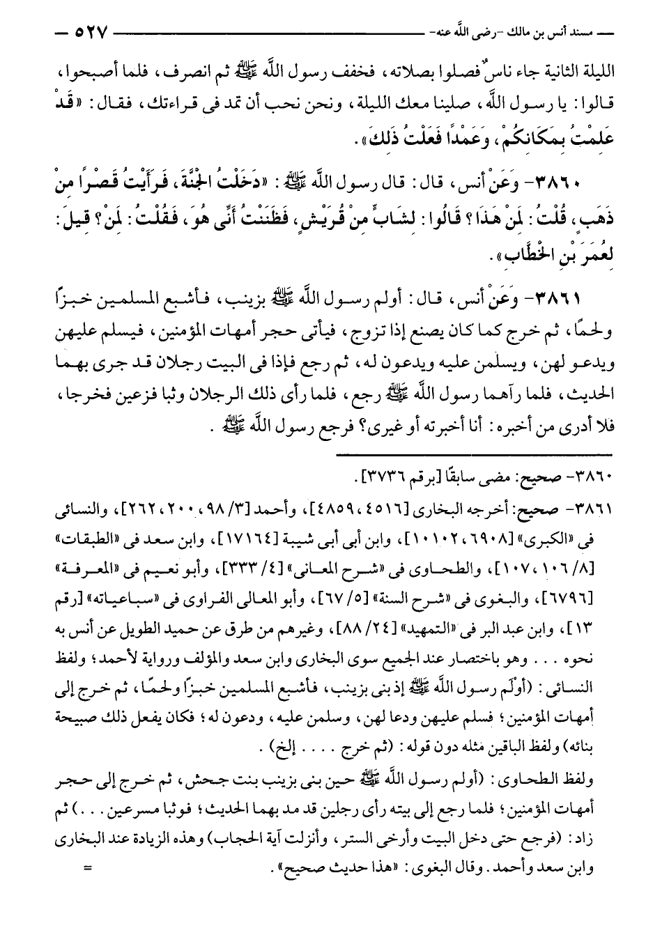 ٣٨٦١ - وَعَنْ أنس، قال: أولم رسول الله - صلى الله عليه وسلم - بزينب، فأشبع المسلمين خبزًا ولحمًا، ثم خرج كما كان يصنع إذا تزوج، فيأتى حجر أمهات المؤمنين، فيسلم عليهن ويدعو لهن، ويسلمن عليه ويدعون له، ثم رجع فإذا في البيت رجلان قد جرى بهما الحديث، فلما رآهما رسول الله - صلى الله عليه وسلم - رجع، فلما رأى ذلك الرجلان وثبا فزعين فخرجا، فلا أدرى من أخبره: أنا أخبرته أو غيرى؟ فرجع رسول الله - صلى الله عليه وسلم -.