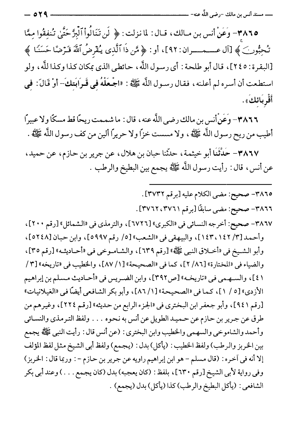 ٣٨٦٥ - وَعَنْ أنس بن مالك، قال: لما نزلت: {تَنَالُوا الْبِرَّ حَتَّى تُنْفِقُوا مِمَّا تُحِبُّونَ} [آل عمران: ٩٢]، أو: {مَنْ ذَا الَّذِي يُقْرِضُ اللَّهَ قَرْضًا حَسَنًا} [البقرة: ٢٤٥]، قال أبو طلحة: أي رسول الله، حائطى الذي بمكان كذا وكذا للَّه، ولو استطعت أن أسره لم أعلنه، فقال رسول الله - صلى الله عليه وسلم -: "اجْعَلْهُ فِي قَرَابَتِكَ - أوْ قالَ: فِي أَقْرِبَائِكَ".