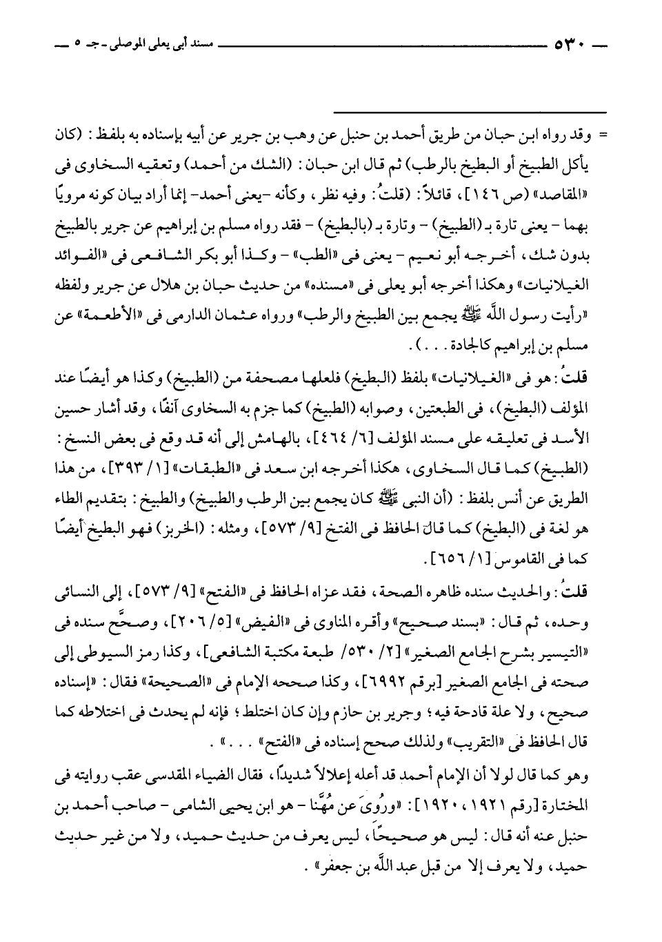 = وقد رواه ابن حبان من طريق أحمد بن حنبل عن وهب بن جرير عن أبيه بإسناده به بلفظ: (كان يأكل الطبيخ أو البطيخ بالرطب) ثم قال ابن حبان: (الشك من أحمد) وتعقبه السخاوى في "المقاصد" [ص ١٤٦]، قائلًا: (قلتُ: وفيه نظر، وكأنه - يعنى أحمد - إنما أراد بيان كونه مرويًا بهما - يعنى تارة بـ (الطبيخ) - وتارة بـ (بالبطيخ) - فقد رواه مسلم بن إبراهيم عن جرير بالطبيخ بدون شك، أخرجه أبو نعيم - يعنى في "الطب" - وكذا أبو بكر الشافعي في "الفوائد الغيلانيات" وهكذا أخرجه أبو يعلى في "مسنده" من حديث حبان بن هلال عن جرير ولفظه "رأيت رسول الله - صلى الله عليه وسلم - يجمع بين الطبيخ والرطب" ورواه عثمان الدارمى في "الأطعمة" عن مسلم بن إبراهيم كالجادة ... ).