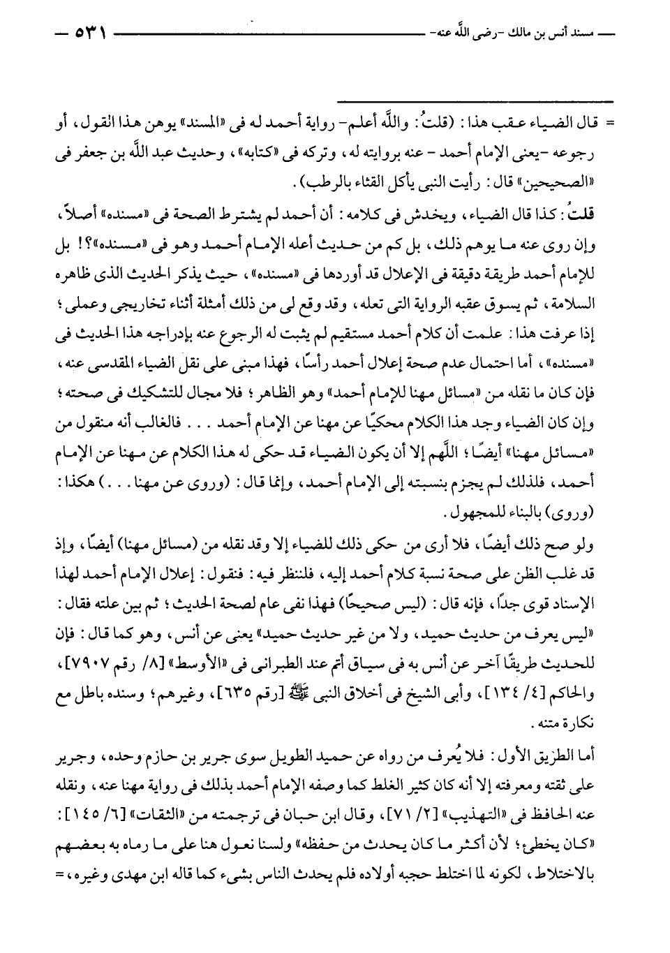 قلتُ: كذا قال الضياء، ويخدش في كلامه: أن أحمد لم يشترط الصحة في "مسنده" أصلًا، وإن روى عنه ما يوهم ذلك، بل كم من حديث أعله الإمام أحمد وهو في "مسنده"؟! بل للإمام أحمد طريقة دقيقة في الإعلال قد أوردها في "مسنده"، حيث يذكر الحديث الذي ظاهره السلامة، ثم يسوق عقبه الرواية التى تعله، وقد وقع لى من ذلك أمثلة أثناء تخاريجى وعملى؛ إذا عرفت هذا: علمت أن كلام أحمد مستقيم لم يثبت له الرجوع عنه بإدراجه هذا الحديث في "مسنده"، أما احتمال عدم صحة إعلال أحمد رأسًا، فهذا مبنى على نقل الضياء المقدسى عنه، فإن كان ما نقل من "مسائل مهنا للإمام أحمد" وهو الظاهر؛ فلا مجال للتشكيك في صحته؛ وإن كان الضياء وجد هذا الكلام محكيًا عن مهنا عن الإمام أحمد ... فالغالب أنه منقول من "مسائل مهنا" أيضًا؛ اللَّهم إلا أن يكون الضياء قد حكى له هذا الكلام عن مهنا عن الإمام أحمد، فلذلك، لم يجزم بنسبته إلى الإمام أحمد، وإنما قال: (وروى عن مهنا ... ) هكذا: (وروى) بالبناء للمجهول.