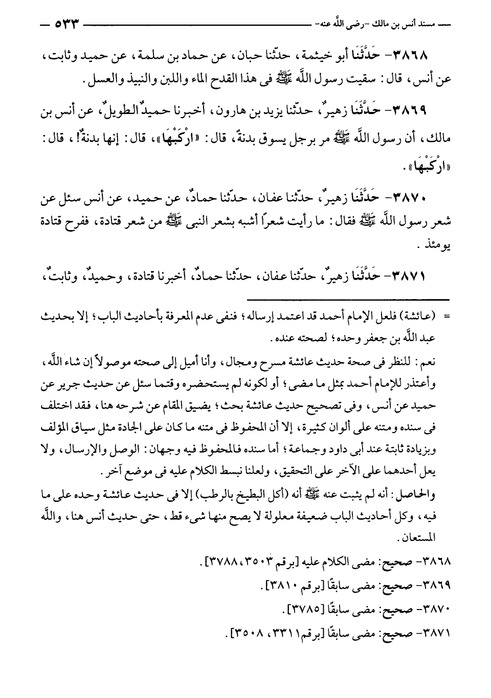 نعم: للنظر في صحة حديث عائشة مسرح ومجال، وأنا أميل إلى صحته موصولًا إن شاء الله، وأعتذر للإمام أحمد بمثل ما مضى؛ أو لكونه لم يستحضره وقتما سئل عن حديث جرير عن حميد عن أنس، وفي تصحيح حديث عائشة بحث؛ يضيق المقام عن شرحه هنا، فقد اختلف في سنده ومتنه على ألوان كثيرة، إلا أن المحفوظ في متنه ما كان على الجادة مثل سياق المؤلف وبزيادة ثابتة عند أبى داود وجماعة؛ أما سنده فالمحفوظ فيه وجهان: الوصل والإرسال، ولا يعل أحدهما على الآخر على التحقيق، ولعلنا نبسط الكلام عليه في موضع آخر.