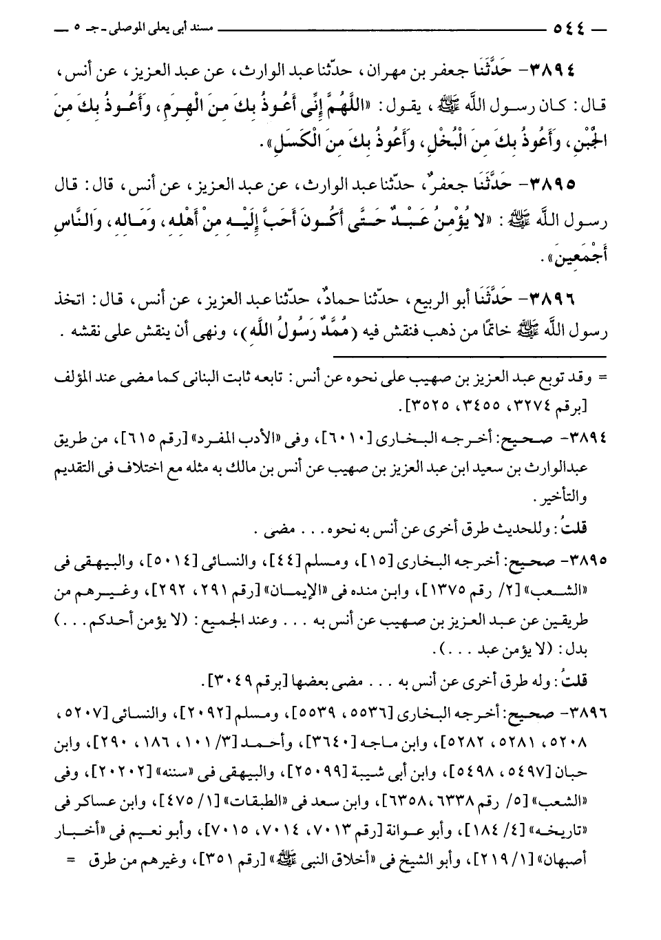٣٨٩٤ - صحيح: أخرجه البخارى [٦٠١٠]، وفى "الأدب المفرد" [رقم ٦١٥]، من طريق عبد الوارث بن سعيد بن عبد العزيز بن صهيب عن أنس بن مالك به مثله مع اختلاف في التقديم والتأخير.