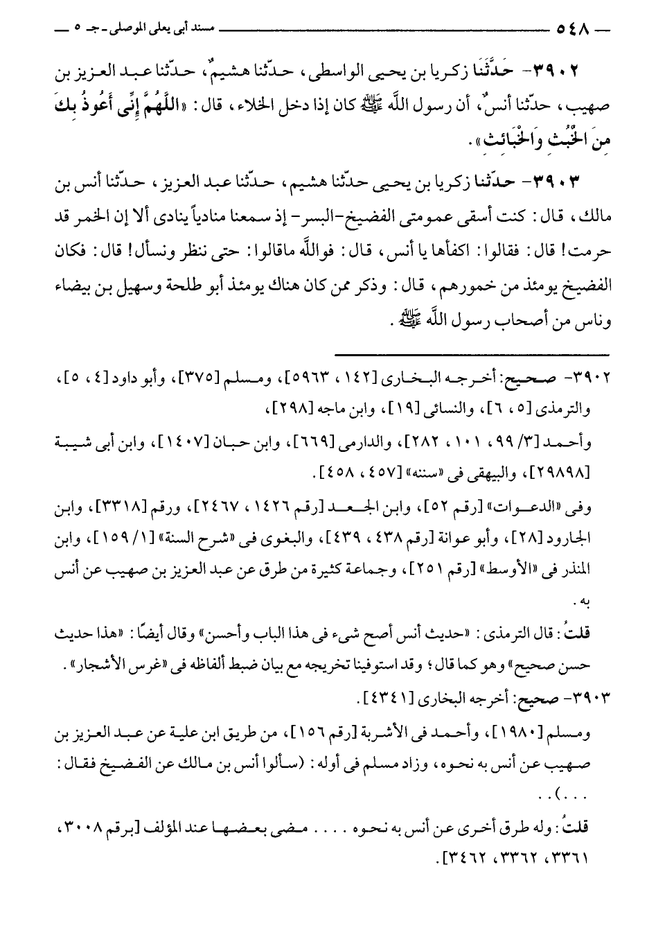 ٣٩٠٢ - حَدَّثَنَا زكريا بن يحيى الواسطى، حدّثنا هشيمٌ، حدّثنا عبد العزيز بن صهيب، حدّثنا أنسٌ، أن رسول الله - صلى الله عليه وسلم - كان إذا دخل الخلاء، قال: "اللَّهُمَّ إِنِّي أَعُوذُ بِكَ مِنَ الْخُبثِ وَالْخبَائِثِ".