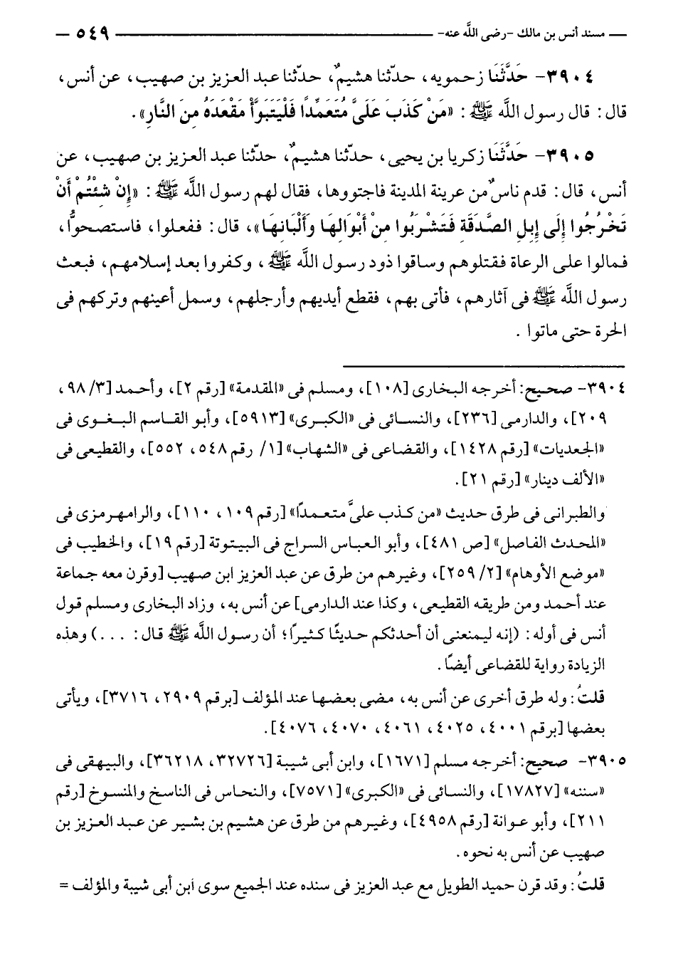 ٣٩٠٤ - حَدَّثَنَا زحمويه، حدّثنا هشيمٌ، حدّثنا عبد العزيز بن صهيب، عن أنس، قال: قال رسول الله - صلى الله عليه وسلم -: "مَنْ كَذَبَ عَلَيَّ متَعَمِّدًا فَلْيَتَبَوَّأْ مَقْعَدَهُ مِنَ النَّارِ".