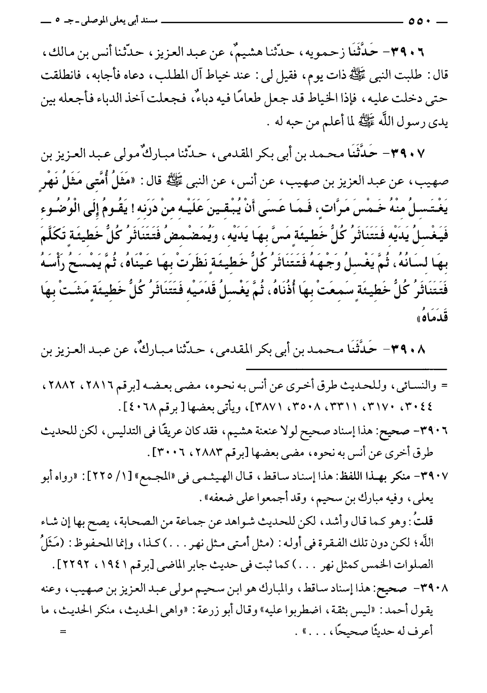 ٣٩٠٧ - حَدَّثَنَا محمد بن أبى بكر المقدمى، حدّثنا مباركٌ مولى عبد العزيز بن صهيب، عن عبد العزيز بن صهيب، عن أنس، عن النبي - صلى الله عليه وسلم - قال: "مَثَلُ أُمَّتِى مَثَلُ نهْرٍ يَغْتَسِلُ مِنْهُ خَمْسَ مَرَّاتٍ، فَمَا عَسَى أَنْ يُبْقِينَ عَلَيْهِ مِنْ دَرَنِهِ! يَقُومُ إِلَى الْوُضُوءِ فَيَغْسِلُ يَدَيْهِ فَتَتَنَاثَرُ كُلُّ خَطِيئَةٍ مَسَّ بِهَا يَدَيْهِ، وَيُمَضْمِضُ فَتَتَنَاثَرُ كُلُّ خَطِيئَةٍ تَكَلَّمَ بِهَا لِسَانُهُ، ثُمَّ يَغْسِلُ وَجْهَهُ فَتَتَنَاثَرُ كُلُّ خَطِيئَةٍ نَظَرَتْ بِهَا عَيْنَاهُ، ثُمَّ يَمْسَحُ رَأْسَهُ فَتَتَنَاثَرُ كُلُّ خَطِيئَةٍ سَمِعَتْ بِهَا أُذُنَاهُ، ثُمَّ يَغْسِلُ قَدَمَيْهِ فَتَتَنَاثَرُ كُلُّ خَطِيئَةٍ مَشَتْ بِهَا قَدَمَاهُ"