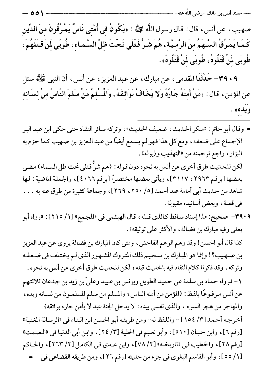 ٣٩٠٩ - حَدَّثَنَا المقدمى، عن مبارك، عن عبد العزيز، عن أنس، أن النبي - صلى الله عليه وسلم - سئل عن المؤمن، قال: "مَنْ أَمِنَهُ جَارُهُ وَلا يَخَافُ بَوَائِقَة، وَالْمسْلِمُ مَنْ سَلِمَ النَّاسُ مِنْ لِسَانِهِ وَيَدِهِ".