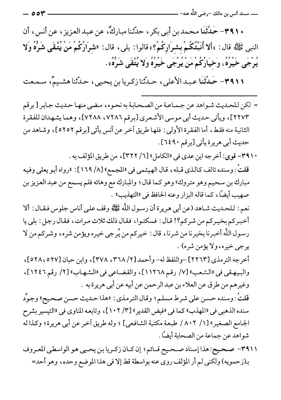 ٣٩١٠ - حَدَّثَنَا محمد بن أبى بكر، حدّثنا مباركٌ، عن عبد العزيز، عن أنس، أن النبي - صلى الله عليه وسلم - قال: "أَلا أُنَبِّئُكُمْ بِشِرَارِكُمْ؟ " قالوا: بلى، قال: "شِرَارُكُمْ مَنْ يُتَّقَى شَرُّهُ وَلا يُرْجَى خَيْرُهُ، وَخِيَارُكُمْ مَنْ يُرْجَى خَيْرُهُ وَلا يُتَقَى شَرُّهُ".