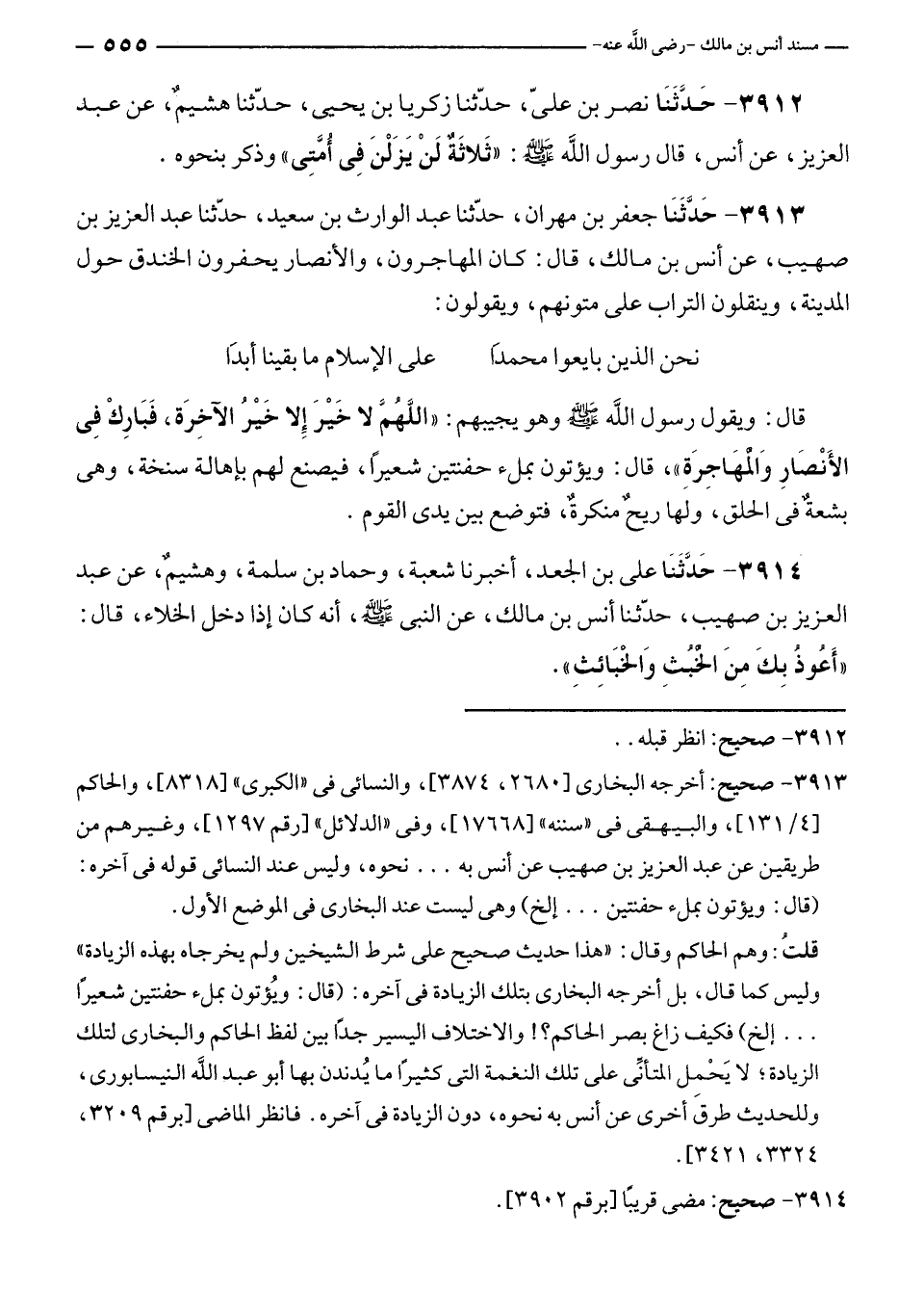 قلتُ: وهم الحاكم وقال: "هذا حديث صحيح على شرط الشيخين ولم يخرجاه بهذه الزيادة" وليس كما قال، بل أخرجه البخارى بتلك الزيادة في آخره: (قال: ويُؤتون بملء حفنتين شعيرًا ... إلخ) فكيف زاغ بصر الحاكم؟! والاختلاف اليسير جدًّا بين لفظ الحاكم والبخارى لتلك الزيادة؛ لا يَحْمل المتأنِّى على تلك النغمة التى كثيرًا ما يُدندن بها أبو عبد الله النيسابورى، وللحديث طرق أخرى عن أنس به نحوه، دون الزيادة في آخره. فانظر الماضى [برقم ٣٢٠٩، ٣٣٢٤، ٣٤٢١].