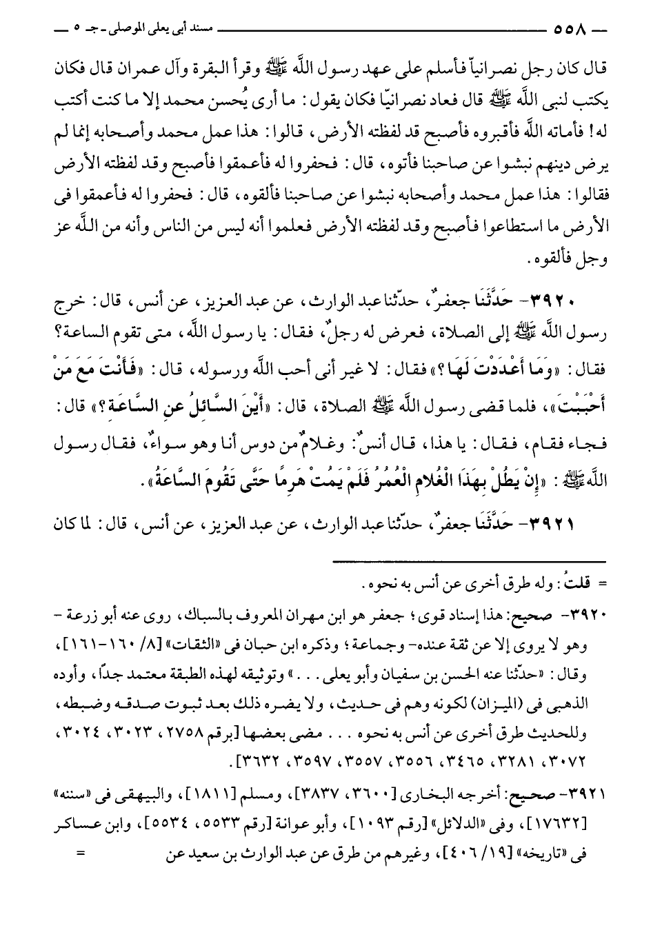٣٩٢٠ - صحيح: هذا إسناد قوى؛ جعفر هو ابن مهران المعروف بالسباك، روى عنه أبو زرعة - وهو لا يروى إلا عن ثقة عنده - وجماعة؛ وذكره ابن حبان في "الثقات" [٨/ ١٦٠ - ١٦١]، وقال: "حدّثنا عنه الحسن بن سفيان وأبو يعلى ... " وتوثيقه لهذه الطبقة معتمد جدًّا، وأوده الذهبى في (الميزان) لكونه وهم في حديث، ولا يضره ذلك بعد ثبوت صدقه وضبطه، وللحديث طرق أخرى عن أنس به نحوه ... مضى بعضها [برقم ٢٧٥٨، ٣٠٢٣، ٣٠٢٤، ٣٠٧٢، ٣٢٨١، ٣٤٦٥، ٣٥٥٦، ٣٥٥٧، ٣٥٩٧. ٣٦٣٢].