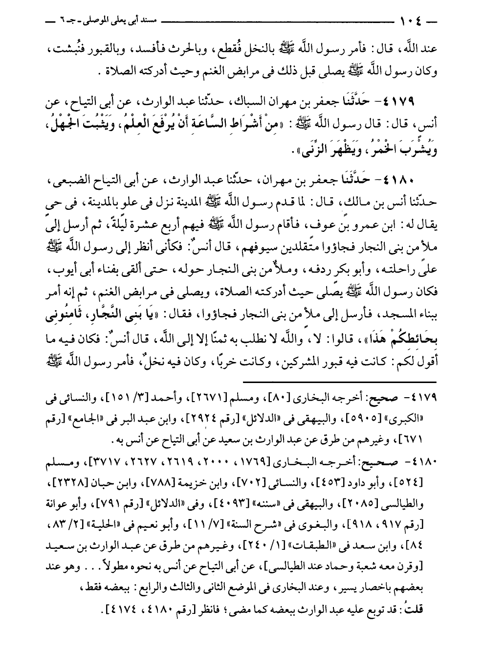 ٤١٨٠ - حَدَّثَنَا جعفر بن مهران، حدّثنا عبد الوارث، عن أبي التياح الضبعى، حدّثنا أنس بن مالكٍ، قال: لما قدم رسول الله - صلى الله عليه وسلم - المدينة نزل في علوٍ بالمدينة؛ في حيٍ يقال له: ابن عمرو بن عوفٍ، فأقام رسول الله - صلى الله عليه وسلم - فيهم أربع عشرة ليلةً، ثم أرسل إلى ملأٍ من بنى النجار فجاؤوا متقلدين سيوفهم، قال أنسٌ: فكأنى أنظر إلى رسول الله - صلى الله عليه وسلم - على راحلته، وأبو بكرٍ ردفه، وملأٌ من بنى النجار حوله، حتى ألقى بفناء أبي أيوب، فكان رسول الله - صلى الله عليه وسلم - يصلى حيث أدركته الصلاة، ويصلى في مرابض الغنم، ثم إنه أمر ببناء المسجد، فأرسل إلى ملأٍ من بنى النجار فجاؤوا، فقال: "يَا بَنِي النَّجَّارِ، ثَامِنُونِى بحَائطكُمْ هَذَا"، قالوا: لا، واللَّه لا نطلب به ثمنًا إلا إلى الله، قال أنسٌ: فكان فيه ما أَقول لكم: كانت فيه قبور المشركين، وكانت خربًا، وكان فيه نخلٌ، فأمر رسول الله - صلى الله عليه وسلم -
