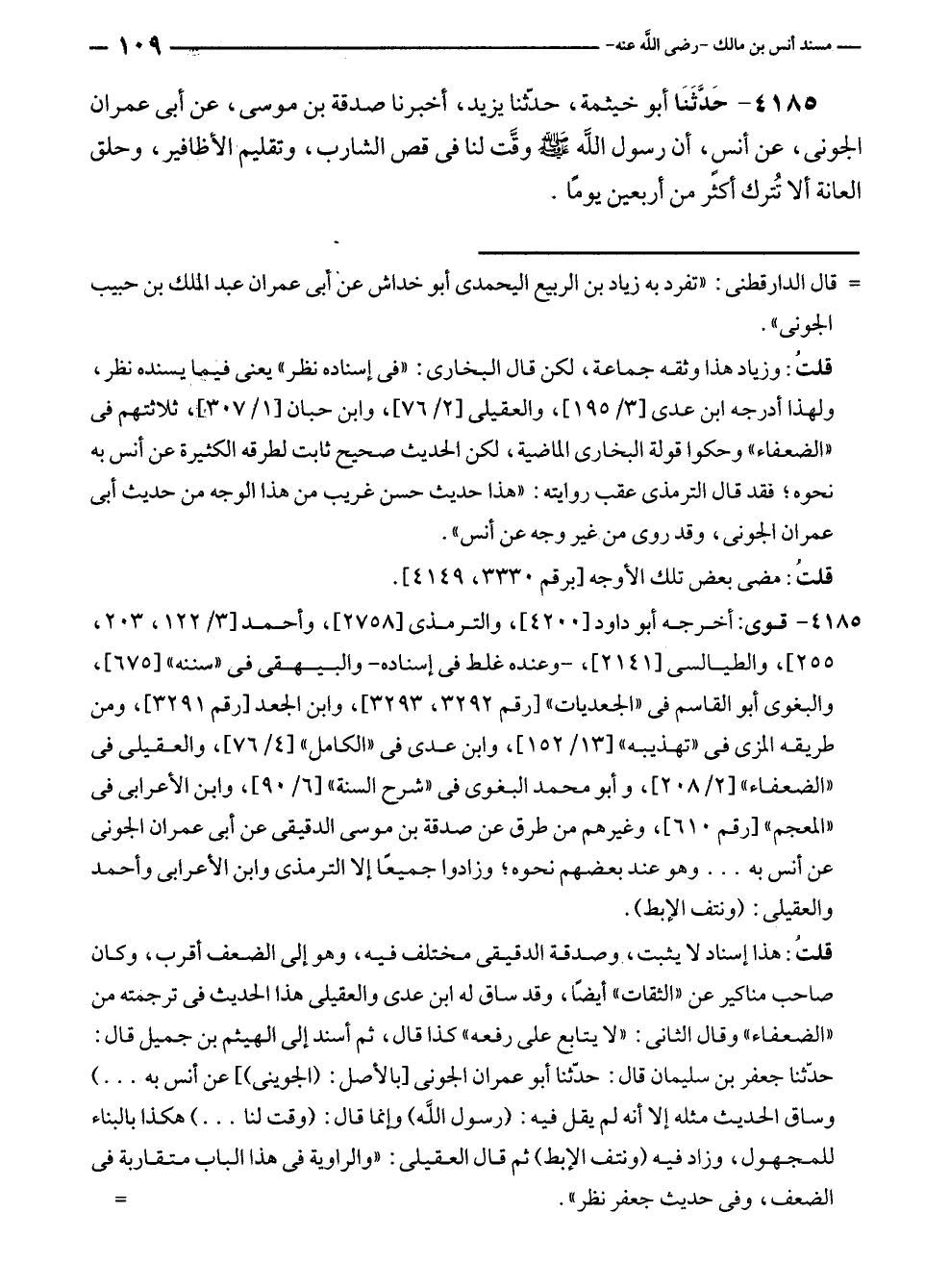 ٤١٨٥ - حَدَّثَنَا أبو خيثمة، حدّثنا يزيد، أخبرنا صدقة بن موسى، عن أبي عمران الجونى، عن أنسٍ، أن رسول الله - صلى الله عليه وسلم - وقَّت لنا في قص الشارب، وتقليم الأظافير، وحلق العانة ألا تُترك أكثر من أربعين يومًا.