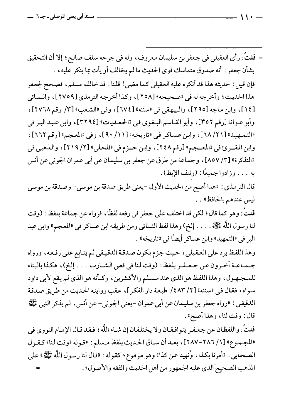 قلتُ: واللفظان عن جعفر يتوافقان ولا يختلفان إن شاء الله؛ فقد قال الإمام النووي في "المجموع" [١/ ٢٨٦ - ٢٨٧]، بعد أن ساق الحديث بلفظ مسلم: "قوله "وقت لنا" كقول الصحابى: "أمرنا بكذا، وُنهينا عن كذا" وهو مرفوع؛ كقوله: "قال لنا رسول الله - صلى الله عليه وسلم -" على المذهب الصحيح الذي عليه الجمهور من أهل الحديث والفقه والأصول". =