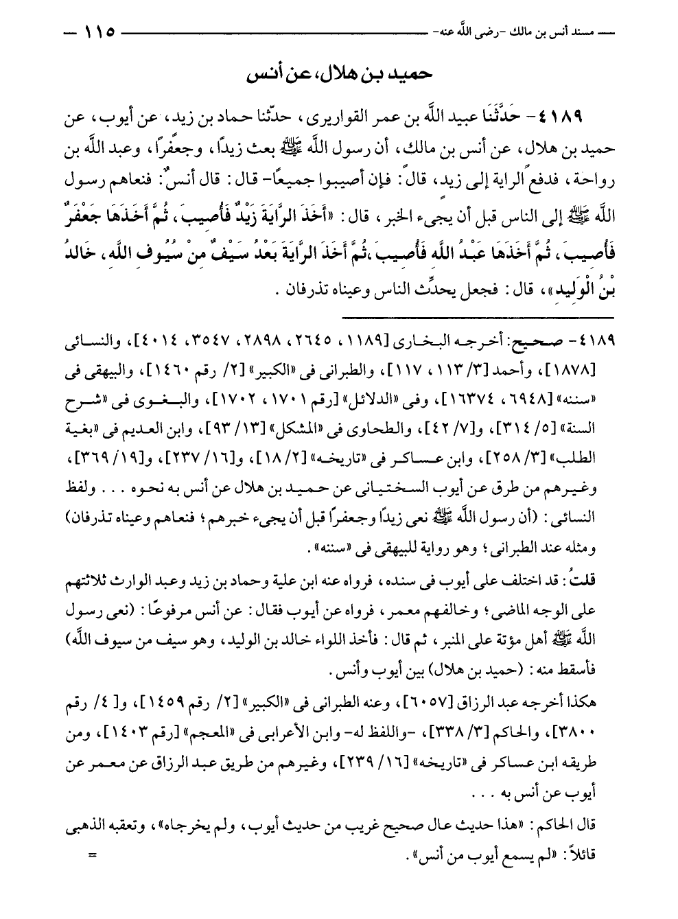 ٤١٨٩ - حَدَّثَنَا عبيد الله بن عمر القواريرى، حدّثنا حماد بن زيد، عن أيوب، عن حميد بن هلالٍ، عن أنس بن مالكٍ، أن رسول الله - صلى الله عليه وسلم - بعث زيدًا، وجعًفرًا، وعبد الله بن رواحة، فدفع الراية إلى زيدٍ، قال: فإن أصيبوا جميعًا - قال: قال أنسٌ: فنعاهم رسول الله - صلى الله عليه وسلم - إلى الناس قبل أن يجئ الخبر، قال: "أَخَذَ الرَّايَةَ زَيْدٌ فَأُصِيبَ، ثُمَّ أَخَذَهَا جَعْفَرٌ فَأُصِيبَ، ثُمَّ أَخَذَهَا عَبْدُ الله فَأُصِيبَ، ثُمَّ أَخَذَ الرَّايَةَ بَعْدُ سَيْفٌ مِنْ سُيُوفِ اللهِ، خَالدُ بْنُ الْوَلِيدِ"، قال: فجعل يحدِّث الناس وعيناه تذرفان.
