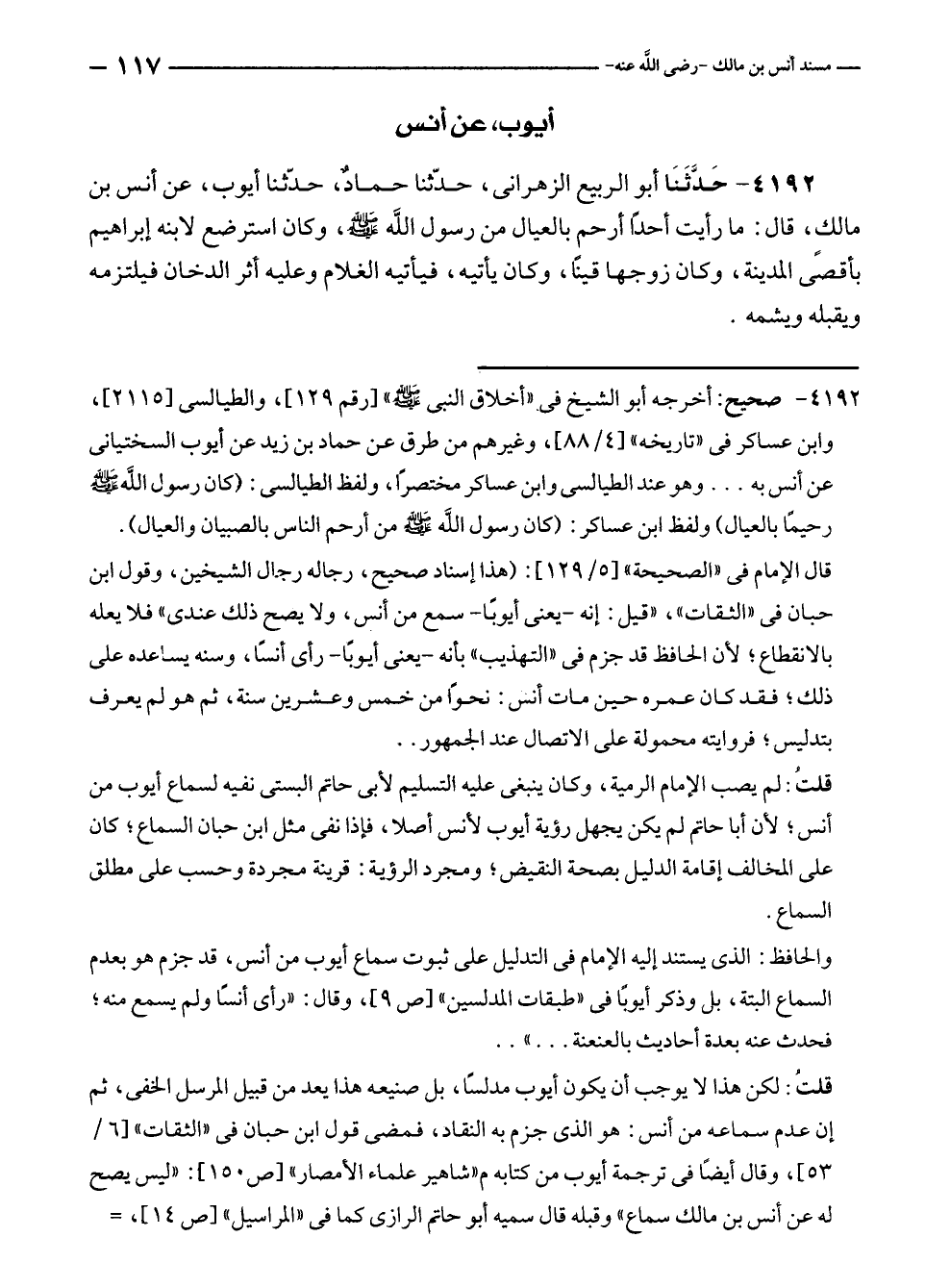 قلتُ: لم يصب الإمام الرمية، وكان ينبغى عليه التسليم لأبى حاتم البستى نفيه لسماع أيوب من أنس؛ لأن أبا حاتم لم يكن يجهل رؤية أيوب لأنس أصلا، فإذا نفى مثل ابن حبان السماع؛ كان على المخالف إقامة الدليل بصحة النقيض؛ ومجرد الرؤية: قرينة مجردة وحسب على مطلق السماع.