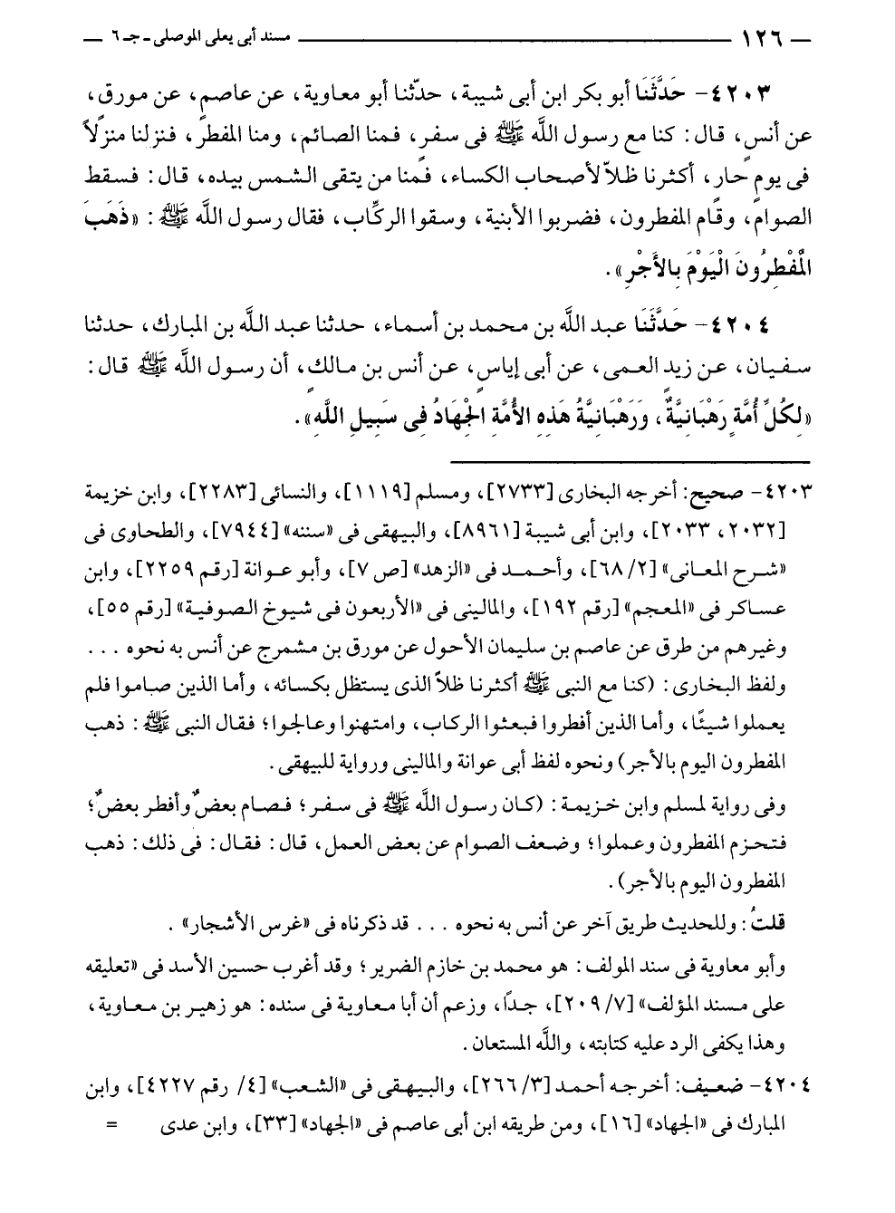 ٤٢٠٣ - حَدَّثَنَا أبو بكر بن أبى شيبة، حدّثنا أبو معاوية، عن عاصمٍ، عن مورقٍ، عن أنس، قال: كنا مع رسول الله - صلى الله عليه وسلم - في سفرٍ، فمنا الصائم، ومنا المفطر، فنزلنا منزلًا في يومٍ حارٍ، أكثرنا ظلّا لأصحاب الكساء، فمنا من يتقى الشمس بيده، قال: فسقط الصوام، وقام المفطرون، فضربوا الأبنية، وسقوا الركِّاب، فقال رسول الله - صلى الله عليه وسلم -: "ذَهَبَ الْمفْطِرُونَ الْيَوْمَ بِالأَجْرِ".