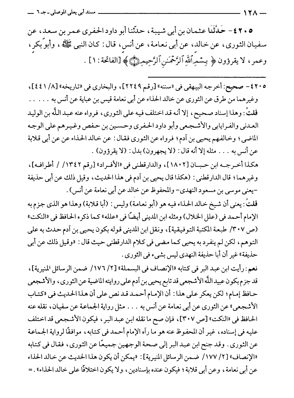 ٤٢٠٥ - حَدَّثَنَا عثمان بن أبى شيبة، حدّثنا أبو داود الحفرى عمر بن سعدٍ، عن سفيان الثورى، عن خالدٍ، عن أبى نعامة، عن أنسٍ، قال: كان النبي - صلى الله عليه وسلم -، وأبو بكرٍ، وعمر، لا يقرؤون {بِسْمِ اللَّهِ الرَّحْمَنِ الرَّحِيمِ (١)} [الفاتحة: ١].