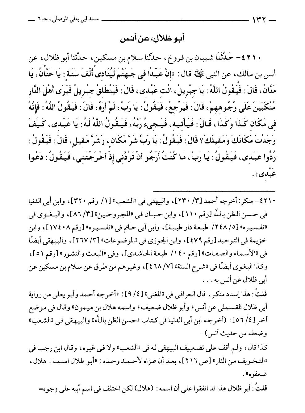 ٤٢١٠ - منكر: أخرجه أحمد [٣/ ٢٣٠]، والبيهقى في "الشعب" [١/ رقم ٣٢٠]، وابن أبى الدنيا في حسن الظن بالله [رقم ١١٠]، وابن حبان في "المجروحين" [٣/ ٨٦]، والبغوى في "تفسيره" [٥/ ٢٤٨/ طبعة دار طيبة]، وابن أبى حاتم في "تفسيره" [رقم ١٧٤٠٨]، وابن خزيمة في التوحيد [رقم ٤٧٩]، وابن الجوزى في "الموضوعات" [٣/ ٢٦٧]، والبيهقى أيضًا في "الأسماء والصفات" [رقم ١٤٠/ طبعة الحاشدى]، وفى "البعث والنشور" [رقم ٥١]، وكذا البغوى أيضًا في "شرح السنة" [٧/ ٤٦٨]، وغيرهم من طرق عن سلام بن مسكين عن أبى ظلال عن أنس به ...