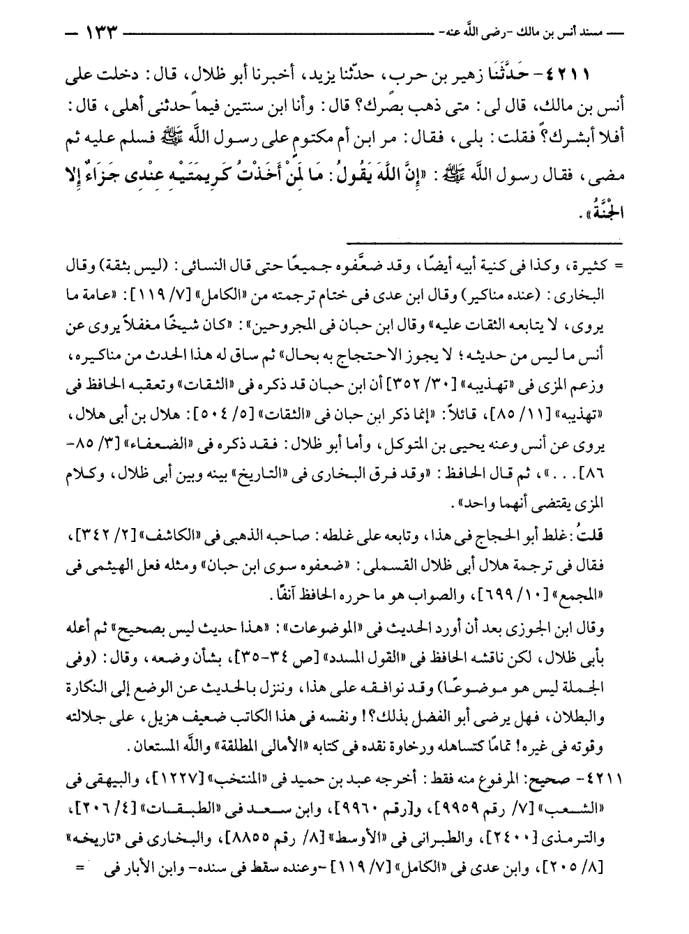 ٤٢١١ - حَدَّثَنَا زهير بن حربٍ، حدّثنا يزيد، أخبرنا أبو ظلالٍ، قال: دخلت على أنس بن مالكٍ، قال لى: متى ذهب بصرك؟ قال: وأنا ابن سنتين فيما حدثنى أهلى، قال: أفلا أبشرك؟ فقلت: بلى، فقال: مر ابن أم مكتومٍ على رسول الله - صلى الله عليه وسلم - فسلم عليه ثم مضى، فقال رسول الله - صلى الله عليه وسلم -: "إِنَّ اللهَ يَقُولُ: مَا لِمَنْ أَخَذْتُ كَرِيمَتَيْهِ عِنْدِى جَزَاءٌ إِلا الْجنَّةُ".