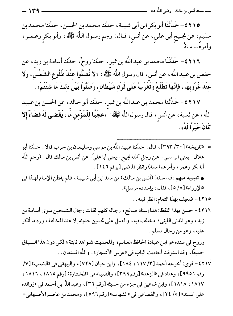 ٤٢١٦ - حسن بهذا اللفظ: هذا إسناد صالح؛ رجاله كلهم ثقات رجال الشيخين سوى أسامة بن زيد، وهو المدنى الليثى؛ مختلف فيه، والعمل على تحسين حديثه إلا عند المخانفة، ورد ما أنكر عليه، وهو من رجال مسلم.