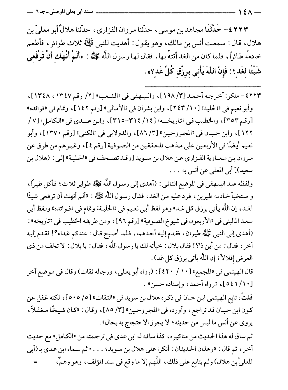 ٤٢٢٣ - حَدَّثَنَا مجاهد بن موسى، حدّثنا مروان الفزارى، حدّثنا هلالٌ أبو معليّ بن هلالٍ، قال: سمعت أنس بن مالكٍ، وهو يقول: أهديت للنبى - صلى الله عليه وسلم - ثلاث طوائر، فأطعم خادمه طائرًا، فلما كان من الغد أتته بها، فقال لها رسول الله - صلى الله عليه وسلم -: "أَلَمْ أَنْهَكِ أَنْ تَرْفَعِى شَيئًا لِغَدٍ؟! فَإِنَّ اللهَ يَأْتِى بِرِزْقِ كُلِّ غَدٍ؟ ".