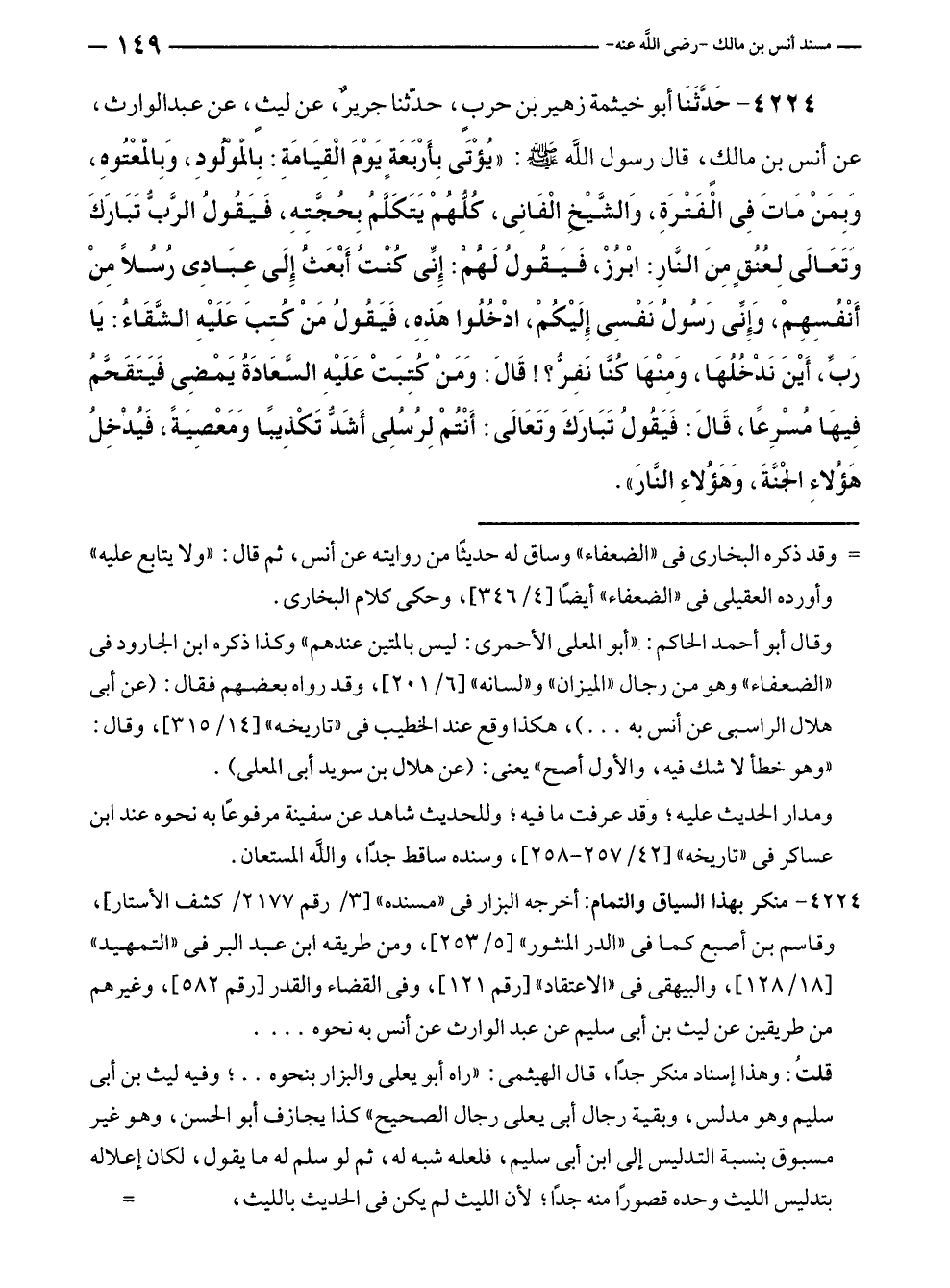 ٤٢٢٤ - حَدَّثَنَا أبو خيثمة زهير بن حربٍ، حدّثنا جريرٌ، عن ليثٍ، عن عبد الوارث، عن أنس بن مالك، قال رسول الله - صلى الله عليه وسلم -: "يُؤْتَى بِأَرْبَعَةٍ يَوْمَ الْقِيَامَةِ: بِالْموْلُودِ، وَبِالْمعْتُوهِ، وَبِمَنْ مَاتَ فِي الْفَتْرَةِ، وَالشَّيْخِ الْفَانِى، كُلُّهُمْ يَتَكَلَّمُ بِحُجَّتِهِ، فَيَقُولُ الرَّبُّ تَبَارَكَ وَتَعَالَى لِعُنُقٍ مِنَ النَّارِ: ابْرُزْ، فَيَقُولُ لَهُمْ: إِنِّي كُنْتُ أَبْعَثْ إِلَى عِبَادِى رُسُلًا مِنْ أَنْفُسِهِمْ، وَإِنِّى رَسُولُ نَفْسِى إِلَيْكُمْ، ادْخُلُوا هَذِهِ، فَيَقُولُ مَنْ كُتِبَ عَلَيْهِ الشَّقَاءُ: يَا رَبِّ، أَيْنَ نَدْخُلُهَا، وَمِنْهَا كُنَّا نَفِرُّ؟! قَالَ: وَمَنْ كُتِبَتْ عَلَيْهِ السَّعَادَةُ يَمْضِى فَيَتَقَحَّمُ فِيهَا مُسْرِعًا، قَالَ: فَيَقُولُ تَبَارَكَ وَتَعَالَى: أَنْتُمْ لِرُسُلِى أَشَدُّ تَكْذِيبًا وَمَعْصِيَةً، فَيُدْخِلُ هَؤُلاءِ الْجنَّةَ، وَهَؤُلاءِ النَّارَ".