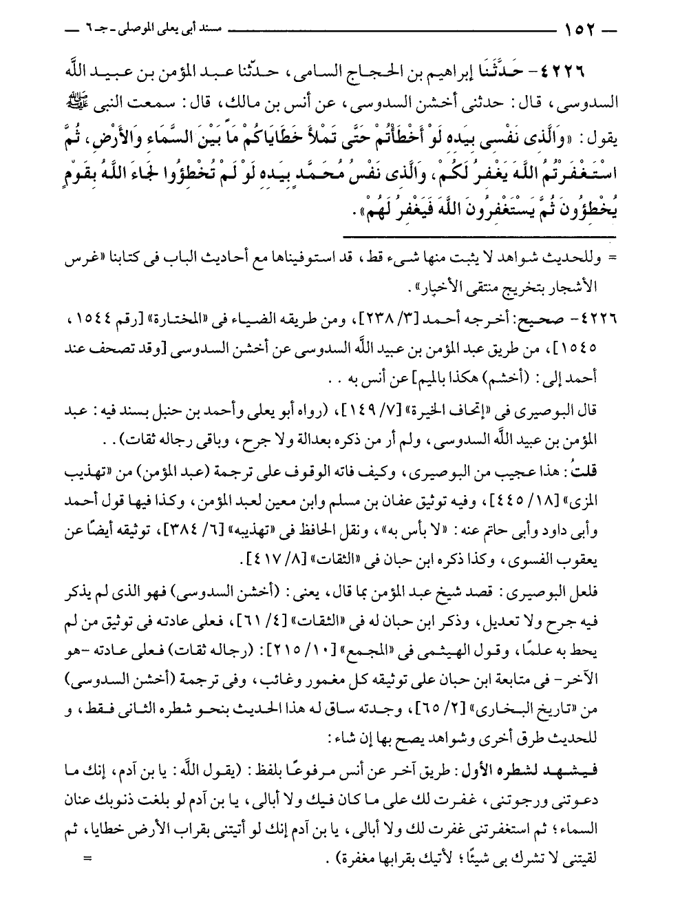 ٤٢٢٦ - حَدَّثَنَا إبراهيم بن الحجاج السامى، حدّثنا عبد المؤمن بن عبيد الله السدوسى، قال: حدثنى أخشن السدوسى، عن أنس بن مالك، قال: سمعت النبي - صلى الله عليه وسلم - يقول: "وَالَّذِى نَفْسِى بِيَدِهِ لَوْ أَخْطَأْتُمْ حَتَّى تَمْلأَ خَطَايَاكُمْ مَا بَيْنَ السَّمَاءِ وَالأَرْضِ، ثُمَّ اسْتَغْفَرْتُمُ اللهَ يَغْفِرُ لَكُمْ، وَالَّذِى نَفْسُ مُحَمَّدٍ بِيَدِهِ لَوْ لَمْ تُخْطِؤُوا لَجَاءَ اللهُ بِقَوْمٍ يُخْطِؤُونَ ثُمَّ يَسْتَغْفِرُونَ اللهَ فَيَغْفِرُ لَهُمْ".