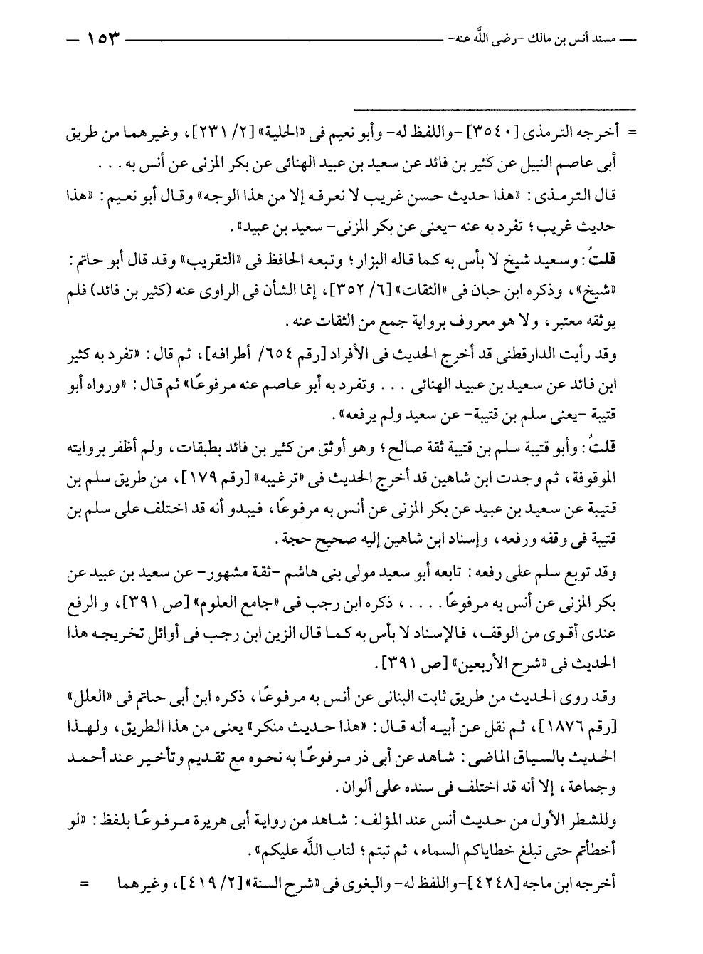 قال الترمذى: "هذا حديث حسن غريب لا نعرفه إلا من هذا الوجه" وقال أبو نعيم: "هذا حديث غريب؛ تفرد به عنه - يعنى عن بكر المزنى - سعيد بن عبيد".