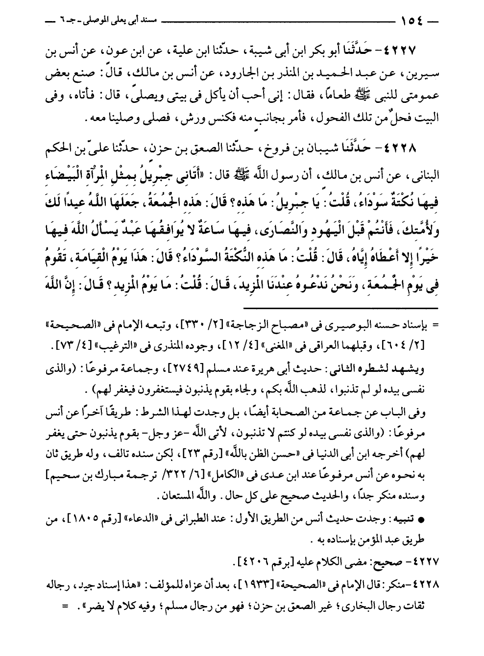 ٤٢٢٨ - حَدَّثَنَا شيبان بن فروخ، حدّثنا الصعق بن حزنٍ، حدّثنا عليّ بن الحكم البنانى، عن أنس بن مالكٍ، أن رسول الله - صلى الله عليه وسلم - قال: "أَتَانِى جِبْرِيل بِمِثْلِ المرْآةِ الْبَيْضَاءِ فِيهَا نُكْتَةٌ سَوْدَاءُ، فلْتُ: يَا جِبْرِيل: مَا هَذِهِ؟ قَالَ: هَذِهِ الْجُمُعَةُ، جَعَلَهَا اللهُ عِيدًا لَكَ وَلأُمَّتِكَ، فَأَنْتمْ قَبْلَ الْيَهُودِ وَالنَّصَارَى، فِيهَا سَاعَةٌ لا يُوَافِقهَا عَبْدٌ يَسْأَلُ اللهَ فِيهَا خَيْرًا إِلا أَعْطَاهُ إِيَّاهُ، قَالَ: قُلْتُ: مَا هَذِهِ النُّكْتَةُ السَّوْدَاءُ؟ قَالَ: هَذَا يَوْمُ الْقِيَامَةِ، تَقُومُ فِي يَوْمِ الْجمُعَةِ، وَنَحْنُ نَدْعُوهُ عِنْدَنَا المزِيدَ، قَالَ: قُلْتُ: مَا يَوْمُ المزِيدِ؟ قَالَ: إِنَّ اللهَ