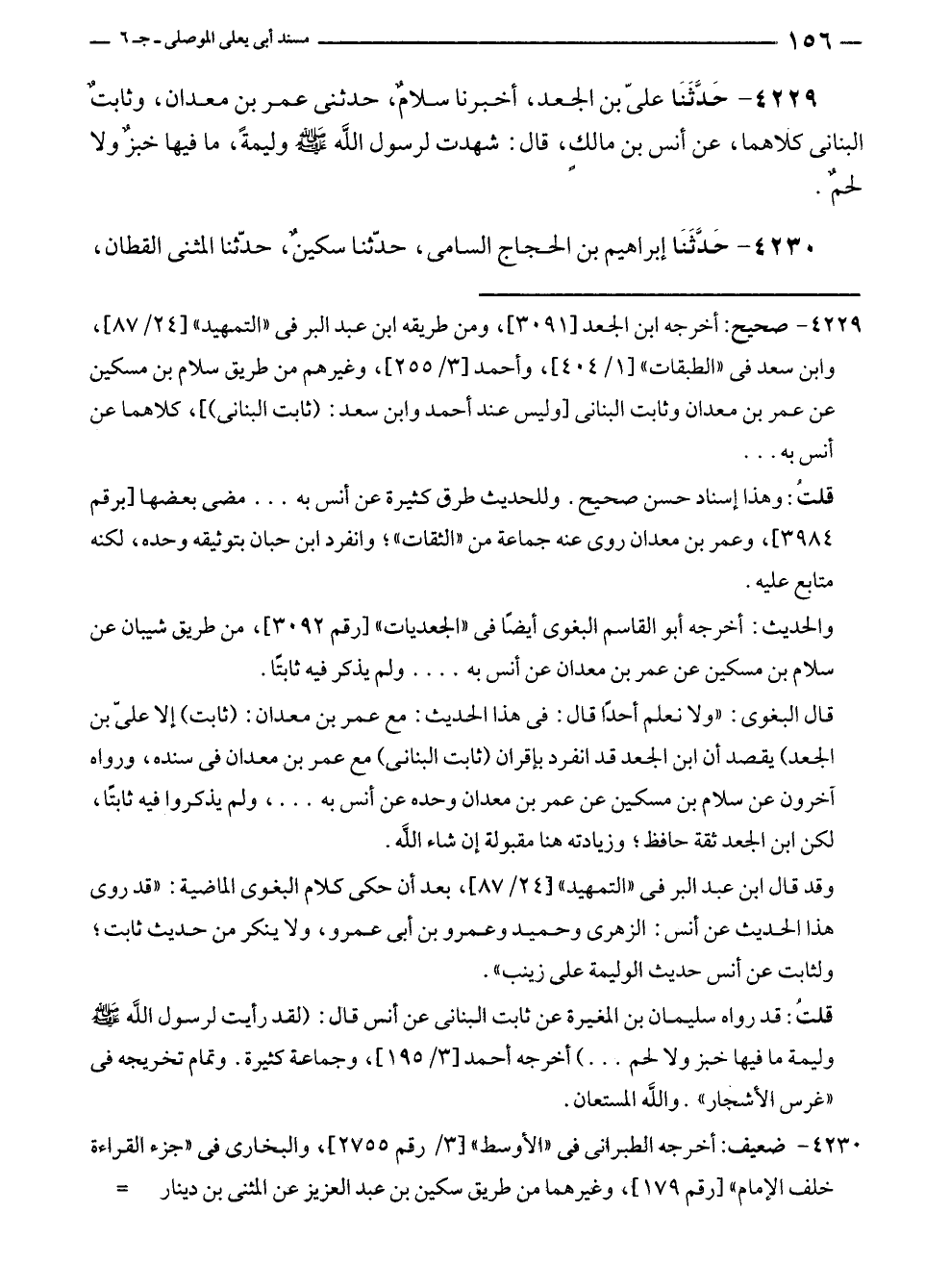 ٤٢٢٩ - حَدَّثَنَا عليّ بن الجعد، أخبرنا سلامٌ، حدثنى عمر بن معدان، وثابتٌ البنانى كلاهما، عن أنس بن مالك، قال: شهدت لرسول الله - صلى الله عليه وسلم - وليمةً، ما فيها خبزٌ ولا لحمٌ.