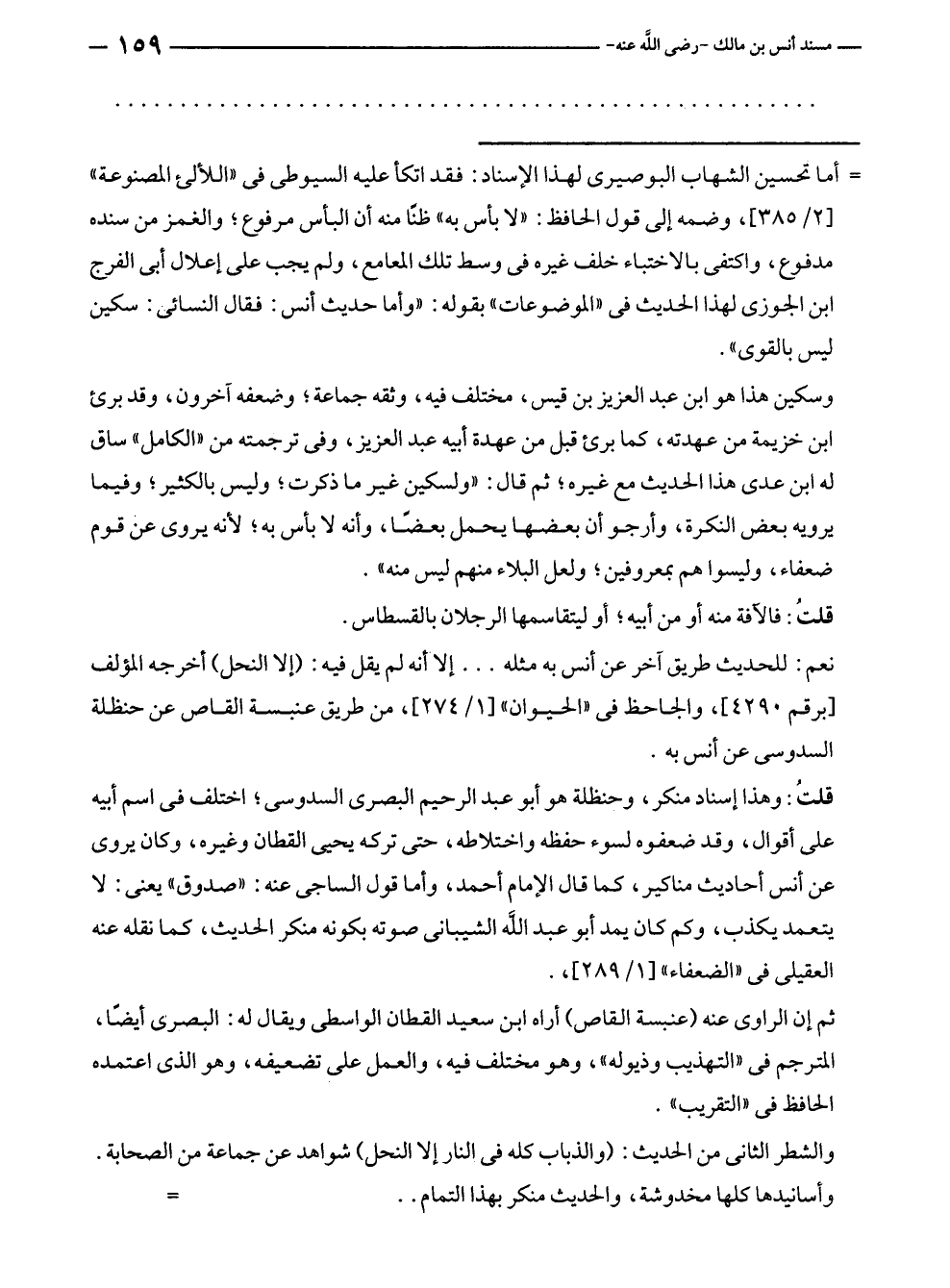 = أما تحسين الشهاب البوصيرى لهذا الإسناد: فقد اتكأ عليه السيوطى في "اللآلئ المصنوعة" [٢/ ٣٨٥]، وضمه إلى قول الحافظ: "لا بأس به" ظنًا منه أن البأس مرفوع؛ والغمز من سنده مدفوع، واكتفى بالاختباء خلف غيره في وسط تلك المعامع، ولم يجب على إعلال أبى الفرج بن الجوزى لهذا الحديث في "الموضوعات" بقوله: "وأما حديث أنس: فقال النسائي: سكين ليس بالقوى".