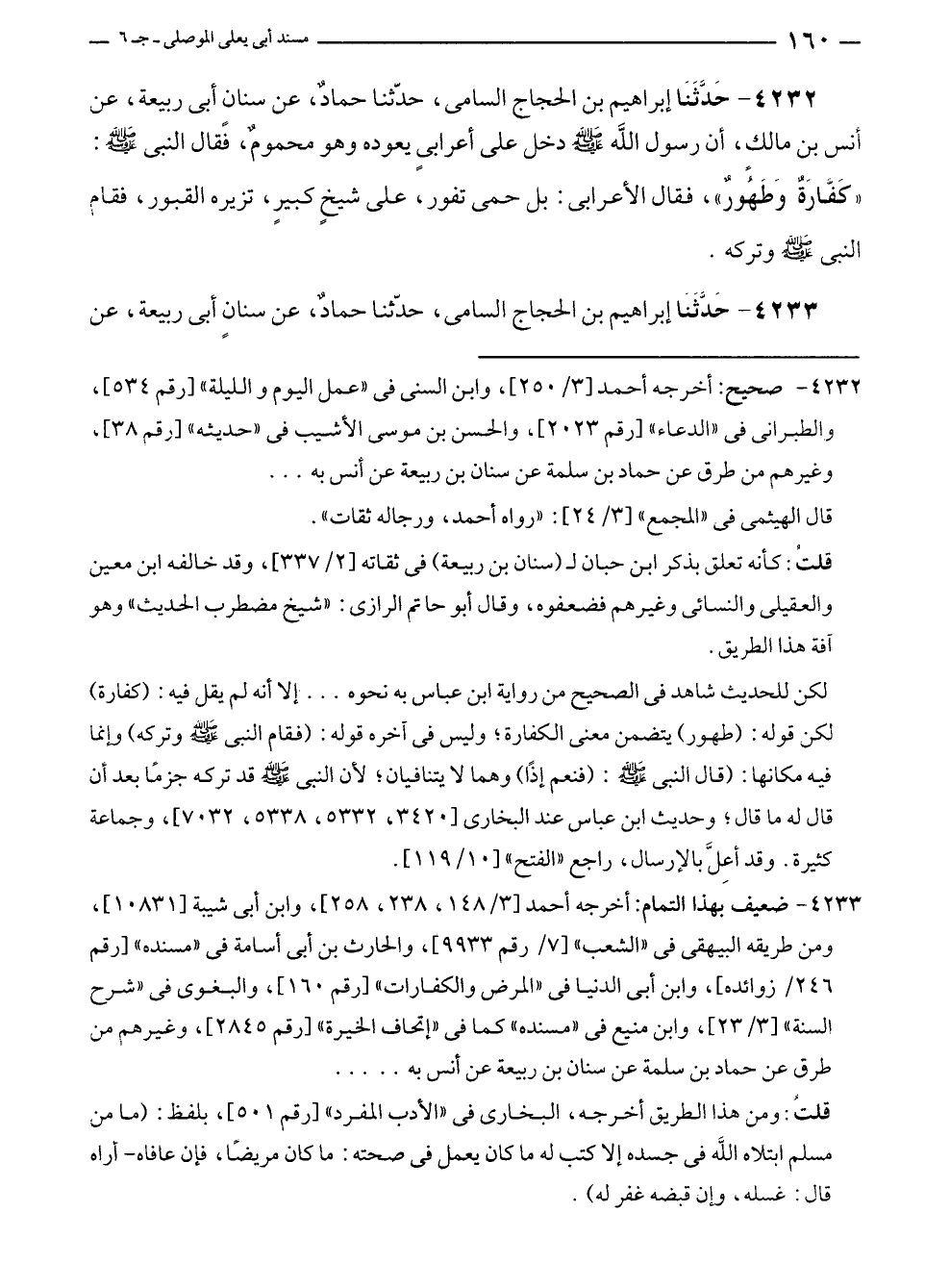 ٤٢٣٢ - حَدَّثَنَا إبراهيم بن الحجاج السامى، حدّثنا حمادٌ، عن سنانٍ أبى ربيعة، عن أنس بن مالكٍ، أن رسول الله - صلى الله عليه وسلم - دخل على أعرابىٍ يعوده وهو محمومٌ، فقال النبي - صلى الله عليه وسلم -: "كَفَّارَةٌ وَطَهُورٌ"، فقال الأعرابى: بل حمى تفور، على شيخٍ كبيرٍ، تزيره القبور، فقاء النبي - صلى الله عليه وسلم - وتركه.