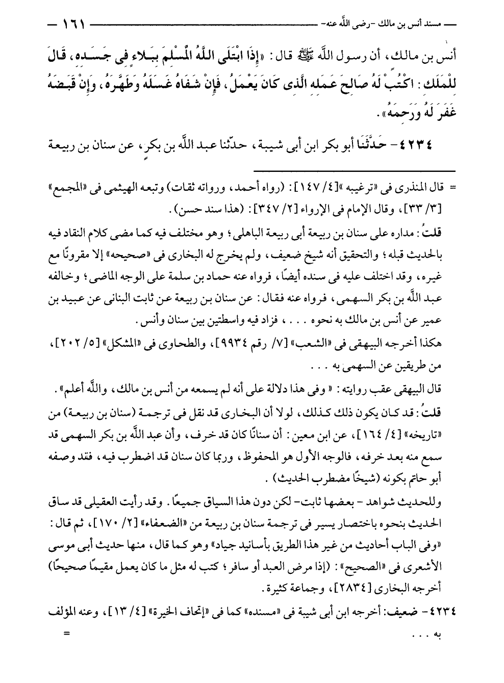 أنس بن مالكٍ، أن رسول الله - صلى الله عليه وسلم - قال: "إِذَا ابْتَلَى اللهُ الْمسْلِمَ بِبَلاءٍ فِي جَسَدِهِ، قَالَ لِلْمَلَكِ: اكْتُبْ لَهُ صَالِحَ عَمَلِهِ الَّذِى كَانَ يَعْمَلُ، فَإِنْ شَفَاهُ غَسَلَهُ وَطَهَّرَهُ، وَإِنْ قَبَضَهُ غَفَرَ لَهُ وَرَحِمَهُ".