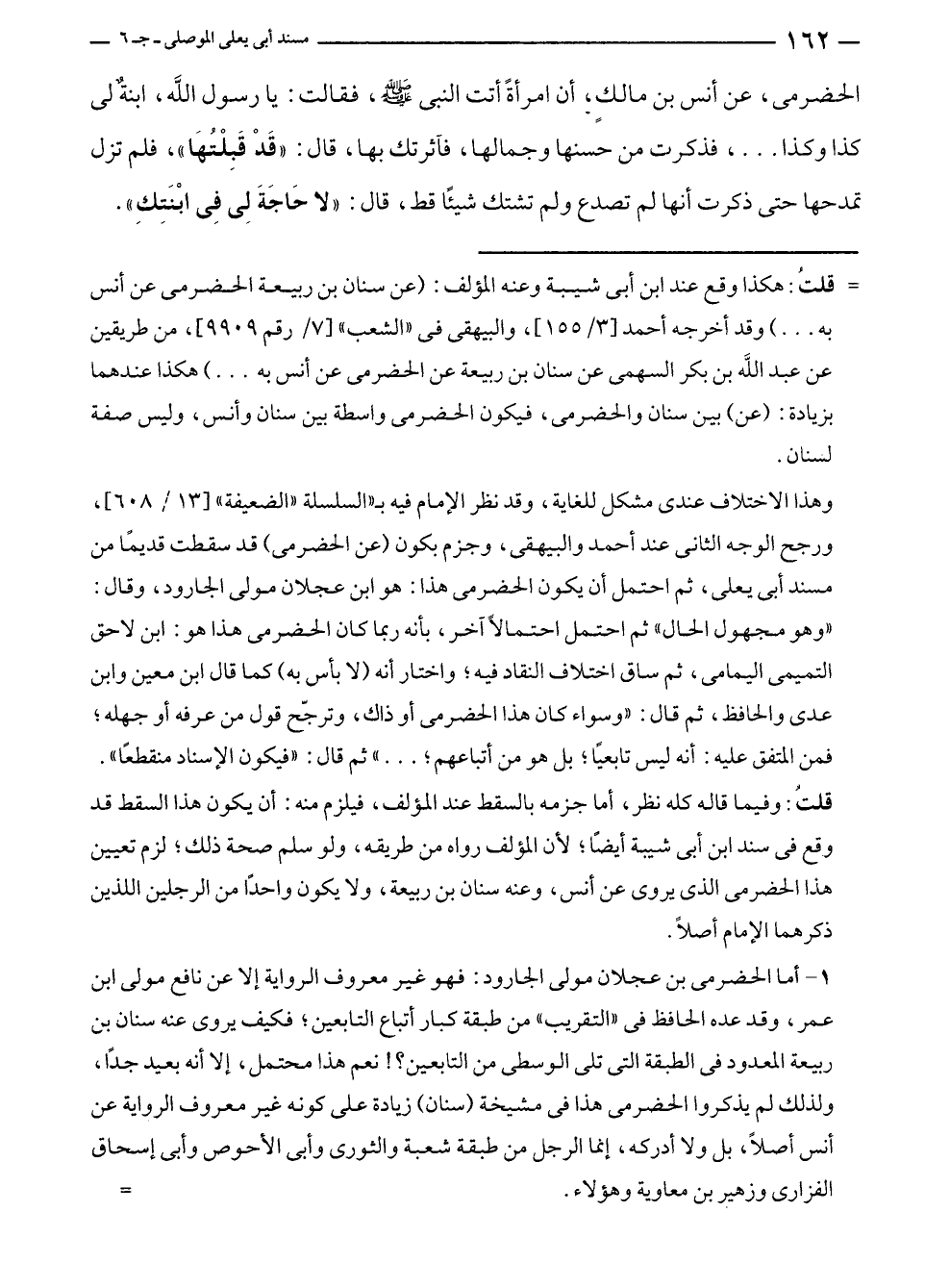 وهذا الاختلاف عندى مشكل للغاية، وقد نظر الإمام فيه بـ "السلسلة الضعيفة" [١٣/ ٦٠٨]، ورجح الوجه الثاني عند أحمد والبيهقى، وجزم بكون (عن الحضرمى) قد سقطت قديمًا من مسند أبى يعلى، ثم احتمل أن يكون الحضرمى هذا: هو ابن عجلان مولى الجارود، وقال: "وهو مجهول الحال" ثم احتمل احتمالًا آخر، بأنه ربما كان الحضرمى هذا هو: ابن لاحق التميمى اليمامى، ثم ساق اختلاف النقاد فيه؛ واختار أنه (لا بأس به) كما قال ابن معين وابن عدى والحافظ، ثم قال: "وسواء كان هذا الحضرمى أو ذاك، وترجّح قول من عرفه أو جهله؛ فمن المتفق عليه: أنه ليس تابعيًا؛ بل هو من أتباعهم؛ ... " ثم قال: "فيكون الإسناد منقطعًا".