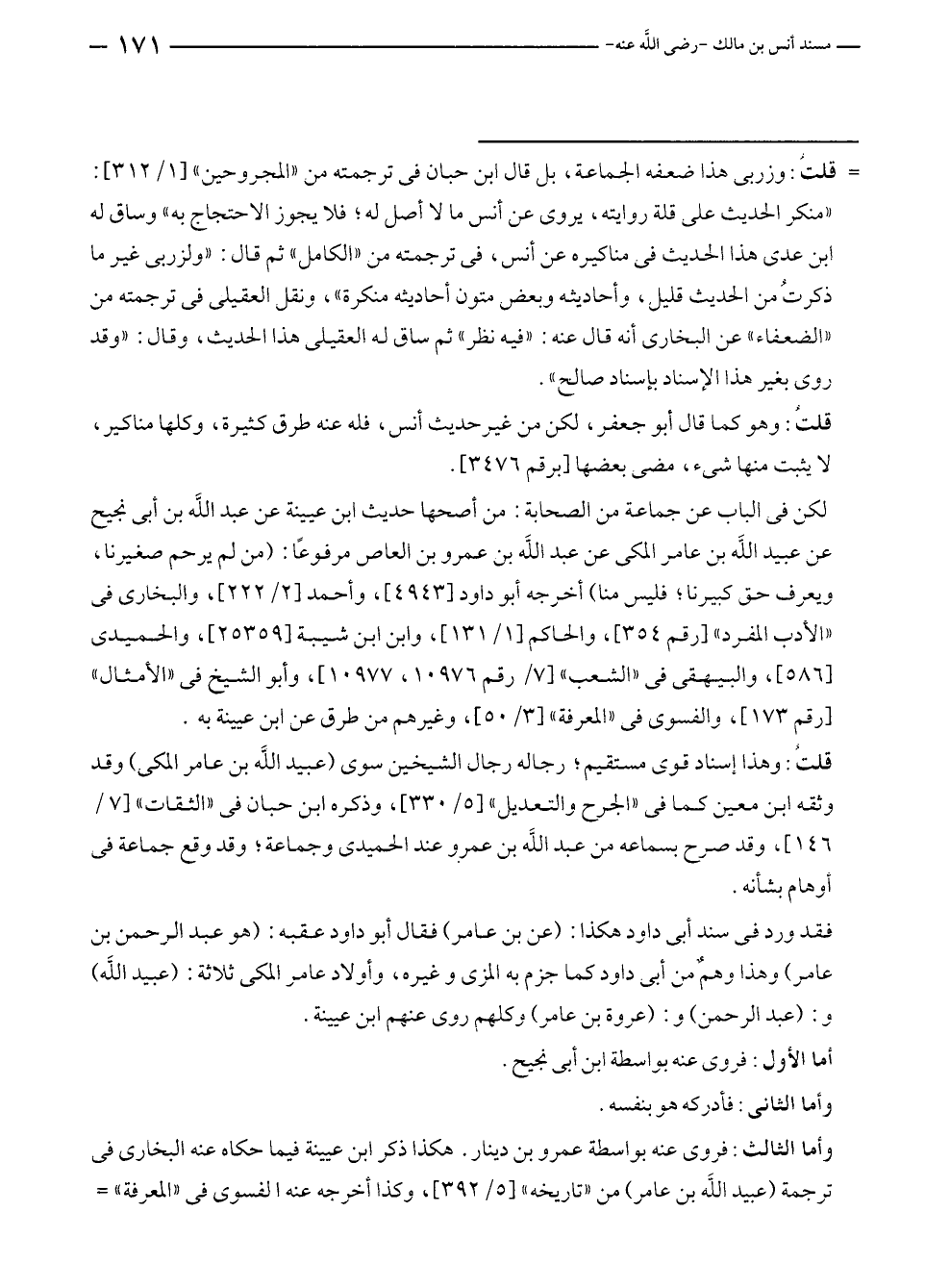 وأما الثالث: فروى عنه بواسطة عمرو بن دينار. هكذا ذكر ابن عيينة فيما حكاه عنه البخارى في ترجمة (عبيد الله بن عامر) من "تاريخه" [٥/ ٣٩٢]، وكذا أخرجه عنه الفسوى في "المعرفة" =
