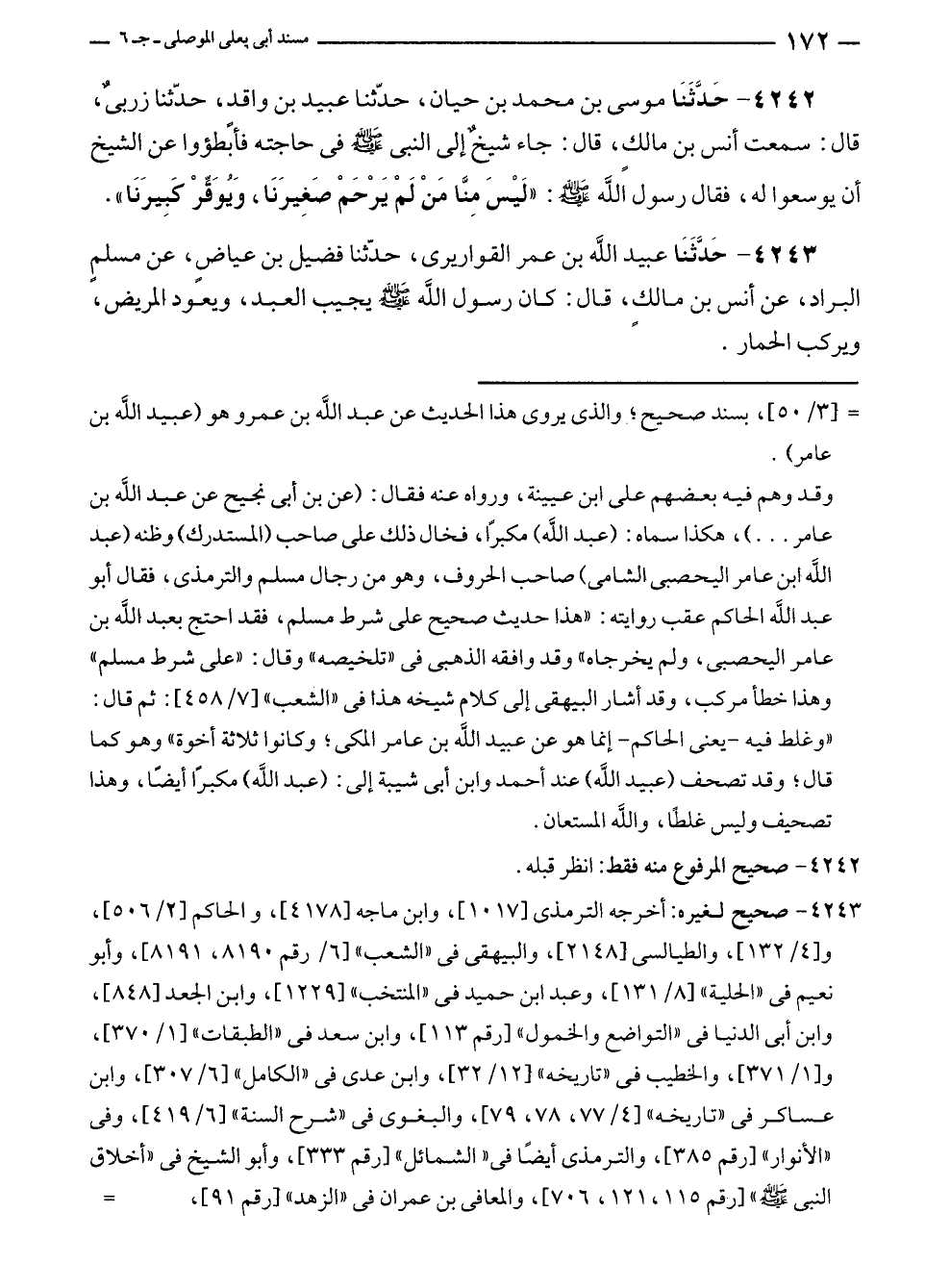 ٤٢٤٢ - حَدَّثَنَا موسى بن محمد بن حيان، حدّثنا عبيد بن واقدٍ، حدّثنا زربىٌ، قال: سمعت أنس بن مالكٍ، قال: جاء شيخٌ إلى النبي - صلى الله عليه وسلم - في حاجته فأبطؤوا عن الشيخ أن يوسعوا له، فقال رسول الله - صلى الله عليه وسلم -: "لَيْسَ مِنَّا مَنْ لَمْ يَرْحَمْ صَغِيرَنَا، وَيُوَقِّرْ كَبِيرَنَا".