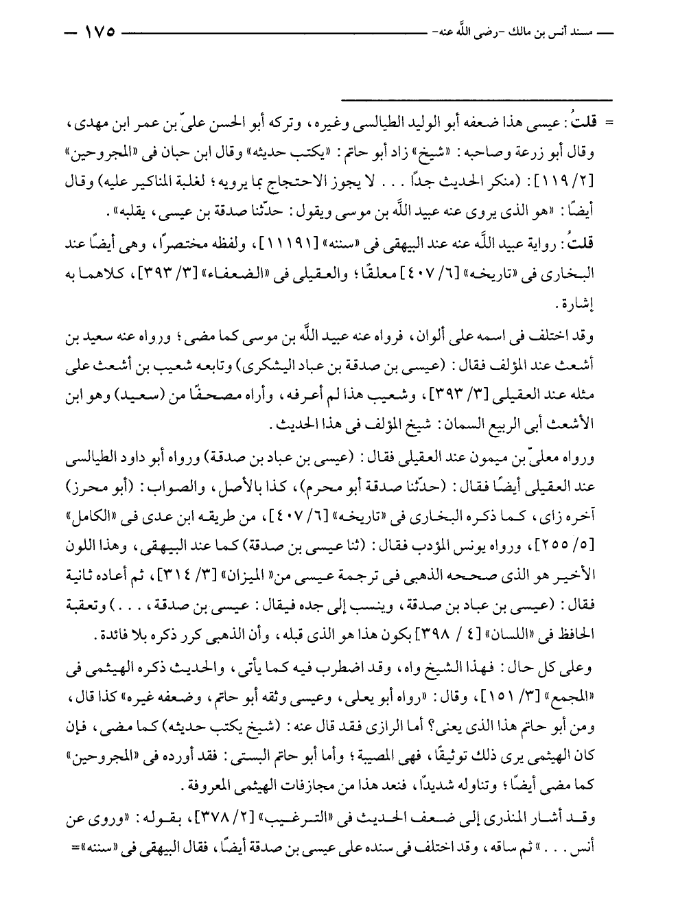 = قلتُ: عيسى هذا ضعفه أبو الوليد الطيالسى وغيره، وتركه أبو الحسن عليّ بن عمر بن مهدى، وقال أبو زرعة وصاحبه: "شيخ" زاد أبو حاتم: "يكتب حديثه" وقال ابن حبان في "المجروحين" [٢/ ١١٩]: (منكر الحديث جدًّا ... لا يجوز الاحتجاج بما يرويه؛ لغلبة المناكير عليه) وقال أيضًا: "هو الذي يروى عنه عبيد الله بن موسى ويقول: حدّثنا صدقة بن عيسى، يقلبه".