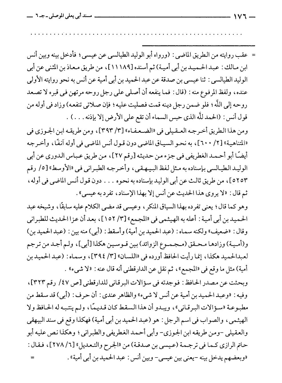 وبحثت عن مصدر الحافظ: فوجدته في سؤالات البرقانى للدارقطنى [ص ٤٧/ رقم ٣٢٣]، وفيه: "وعبد الحميد بن أمية عن أنس لا شئ" والظاهر عندى: أن حرف: (أبى) قد سقط من مطبوعة "سؤالات البرقانى"، ويبدو أن هذا السقط كان قديمًا، ولم ينتبه له الحافظ ولا الهيثمى، والصواب في اسم الرجل: هو (عبد الحميد بن أبى أمية) فهكذا وقع في سند البيهقى والعقيلى - ومن طريقه ابن الجوزى - وأبى أحمد الغطريفى والطبرانى؛ وهكذا نصر، عليه أبو حاتم الرازى كما في ترجمة (عيسى بن صدقة) من "الجرح والتعديل" [٦/ ٢٧٨]، فقال: "وبعضهم يدخل بينه - يعنى بين عيسى - وبين أنس: عبد الحميد بن أبى أمية". =