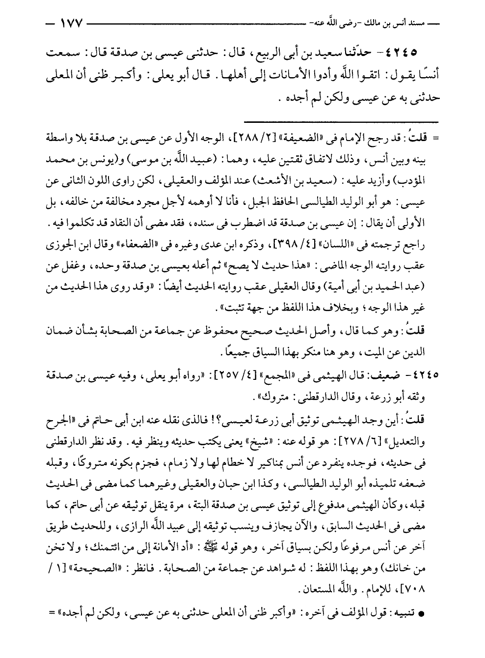 ٤٢٤٥ - حدّثنا سعيد بن أبى الربيع، قال: حدثنى عيسى بن صدقة قال: سمعت أنسًا يقول: اتقوا الله وأدوا الأمانات إلى أهلها. قال أبو يعلى: وأكبر ظنى أن المعلى حدثنى به عن عيسى ولكن لم أجده.